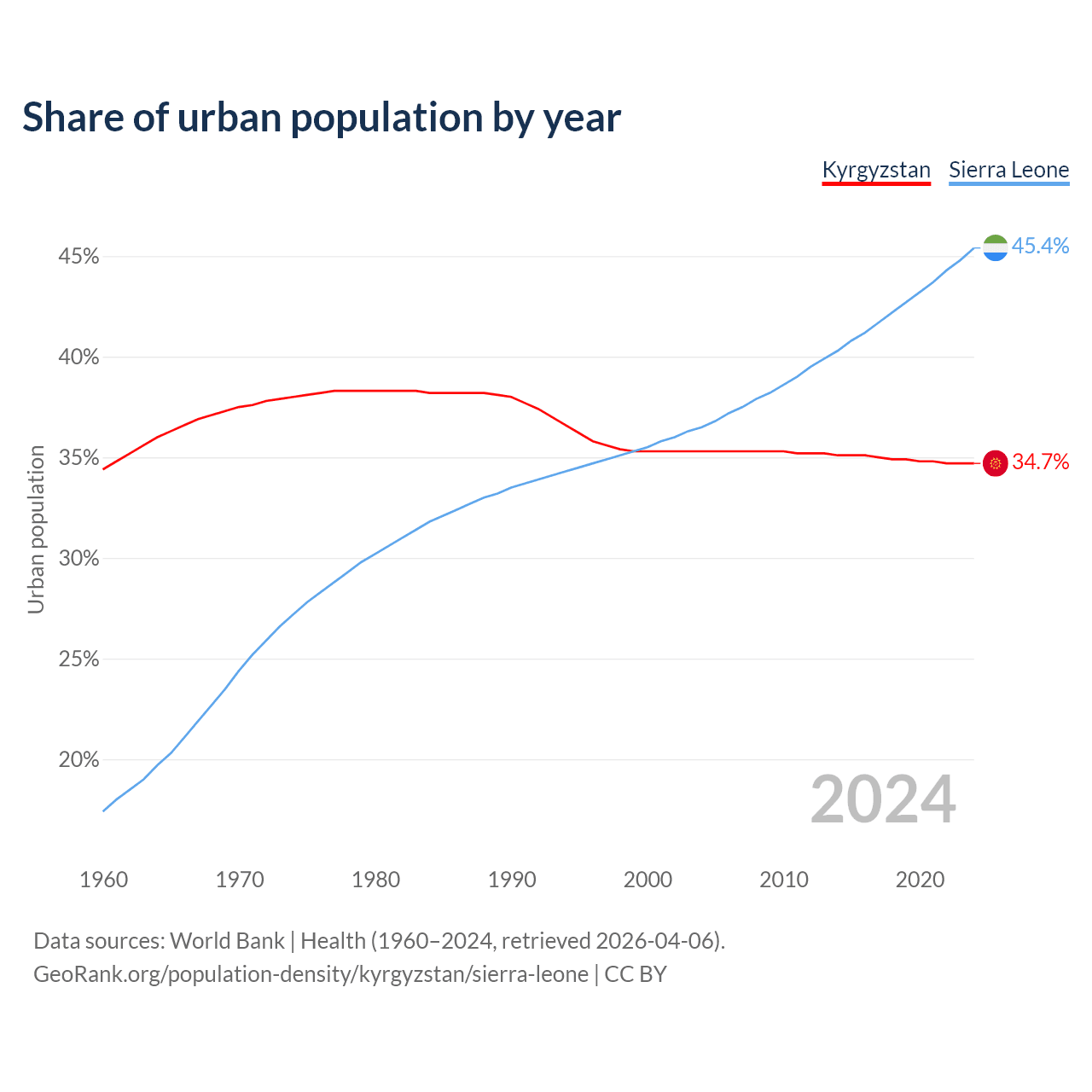 From 2004 to 2024, the share of urban population changed from 35.3% to 34.7% in Kyrgyzstan and from 36.5% to 45.4% in Sierra Leone.