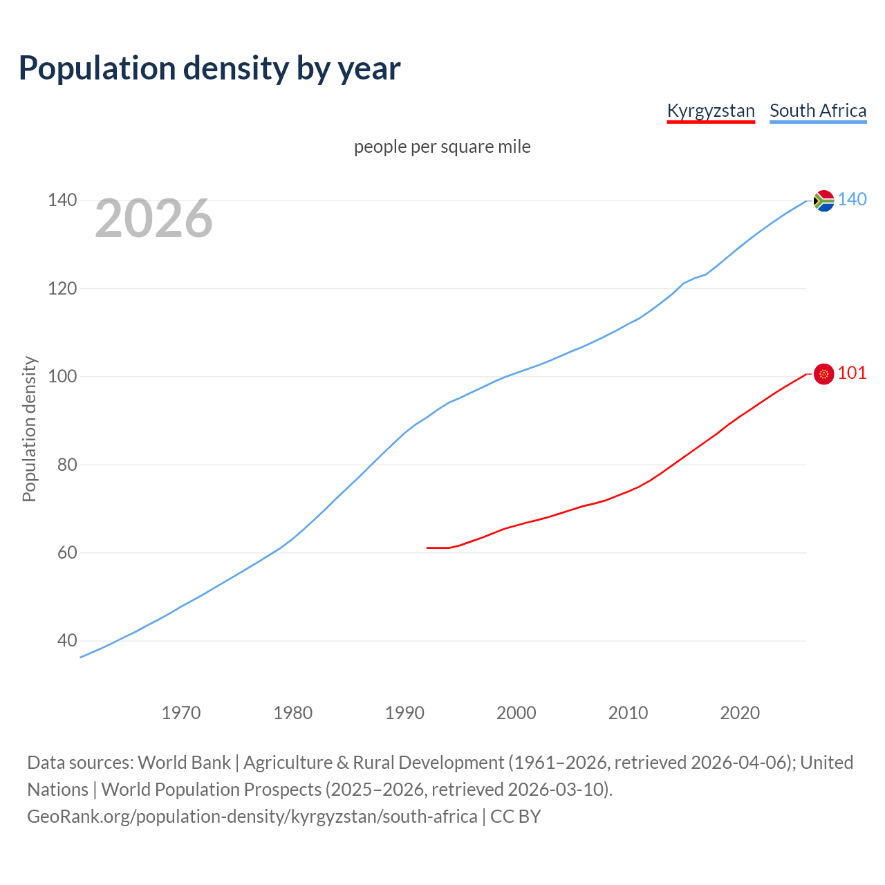 From 2006 to 2026, population density in Kyrgyzstan increased by 42.6%, compared to a 31% growth in South Africa.