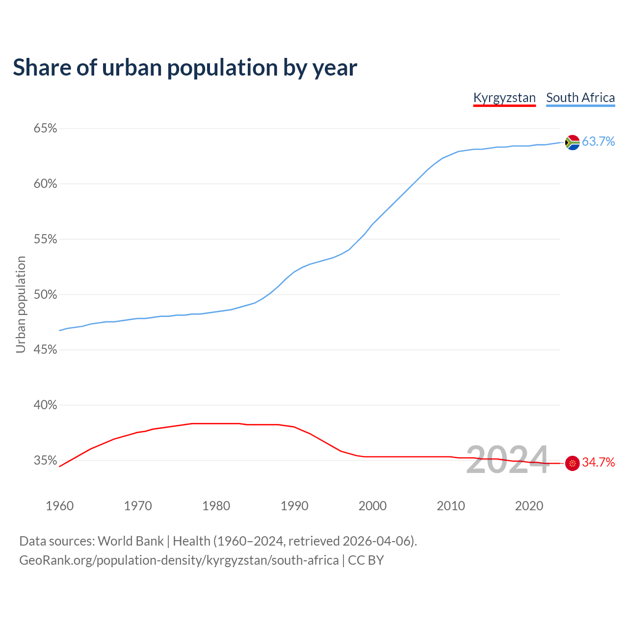 From 2004 to 2024, the share of urban population changed from 35.3% to 34.7% in Kyrgyzstan and from 59.1% to 63.7% in South Africa.