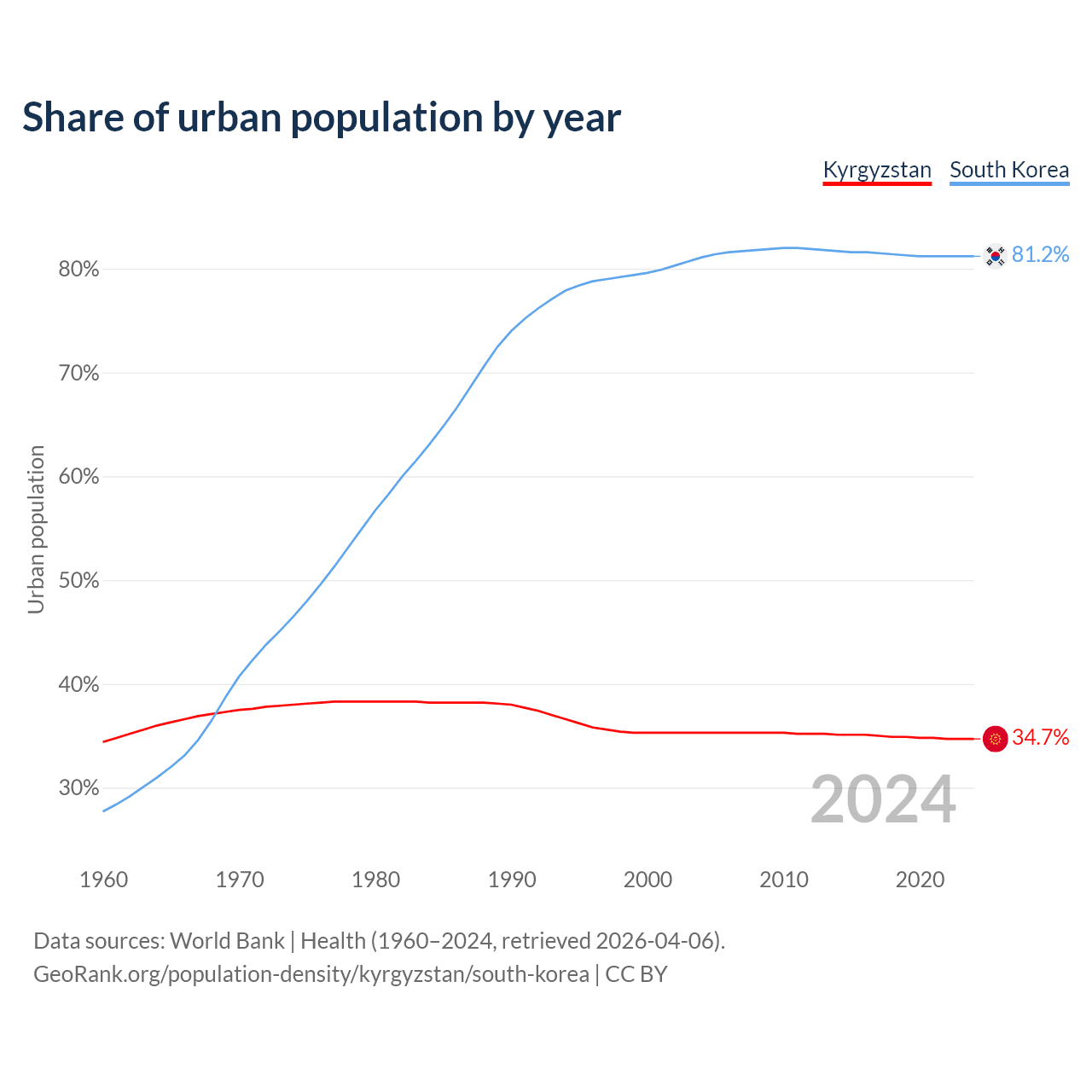 From 2004 to 2024, the share of urban population changed from 35.3% to 34.7% in Kyrgyzstan and from 81.1% to 81.2% in South Korea.