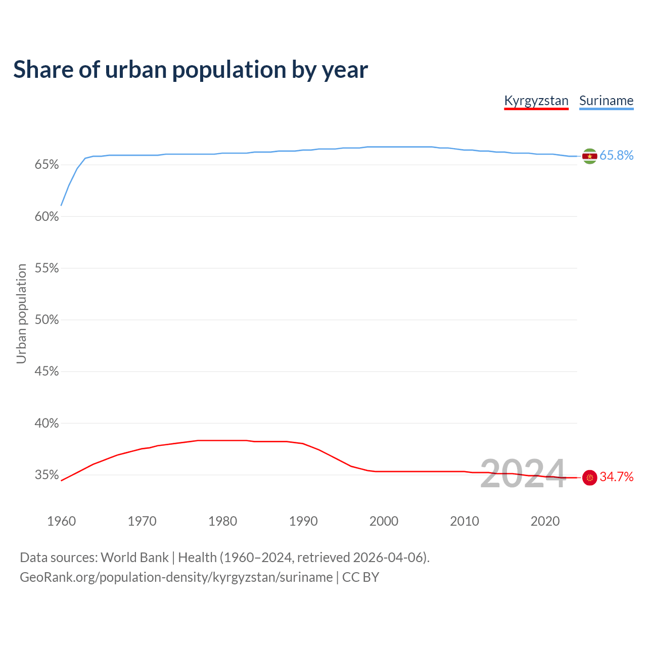 From 2004 to 2024, the share of urban population changed from 35.3% to 34.7% in Kyrgyzstan and from 66.7% to 65.8% in Suriname.
