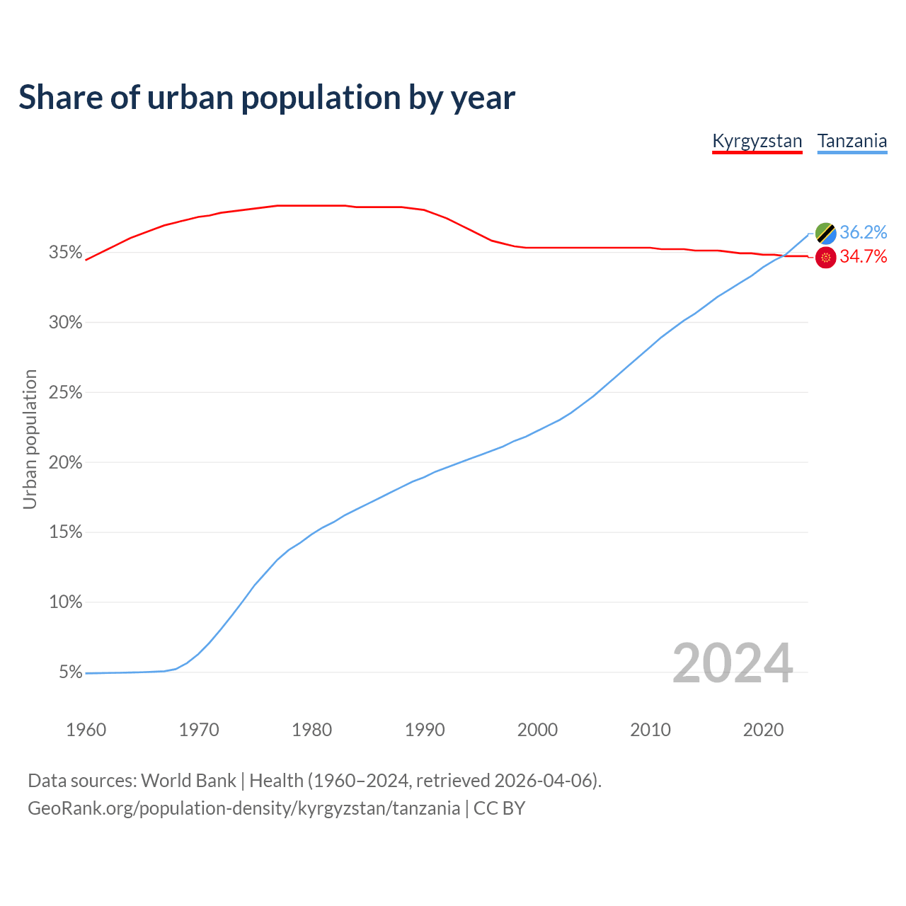 From 2004 to 2024, the share of urban population changed from 35.3% to 34.7% in Kyrgyzstan and from 24.1% to 36.2% in Tanzania.
