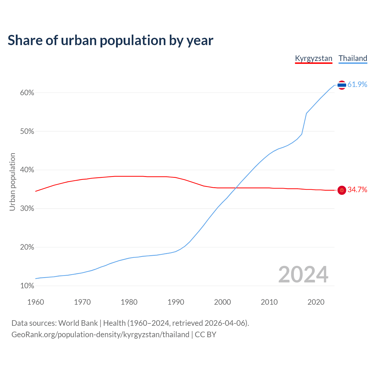From 2004 to 2024, the share of urban population changed from 35.3% to 34.7% in Kyrgyzstan and from 36.8% to 61.9% in Thailand.