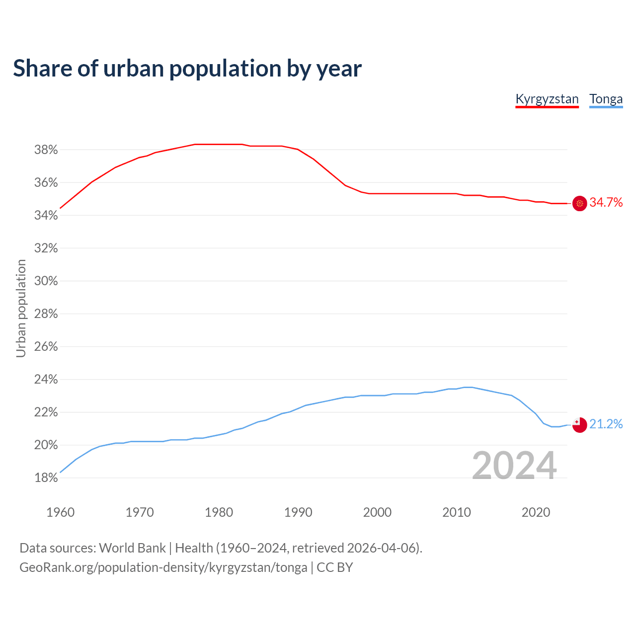 From 2004 to 2024, the share of urban population changed from 35.3% to 34.7% in Kyrgyzstan and from 23.1% to 21.2% in Tonga.
