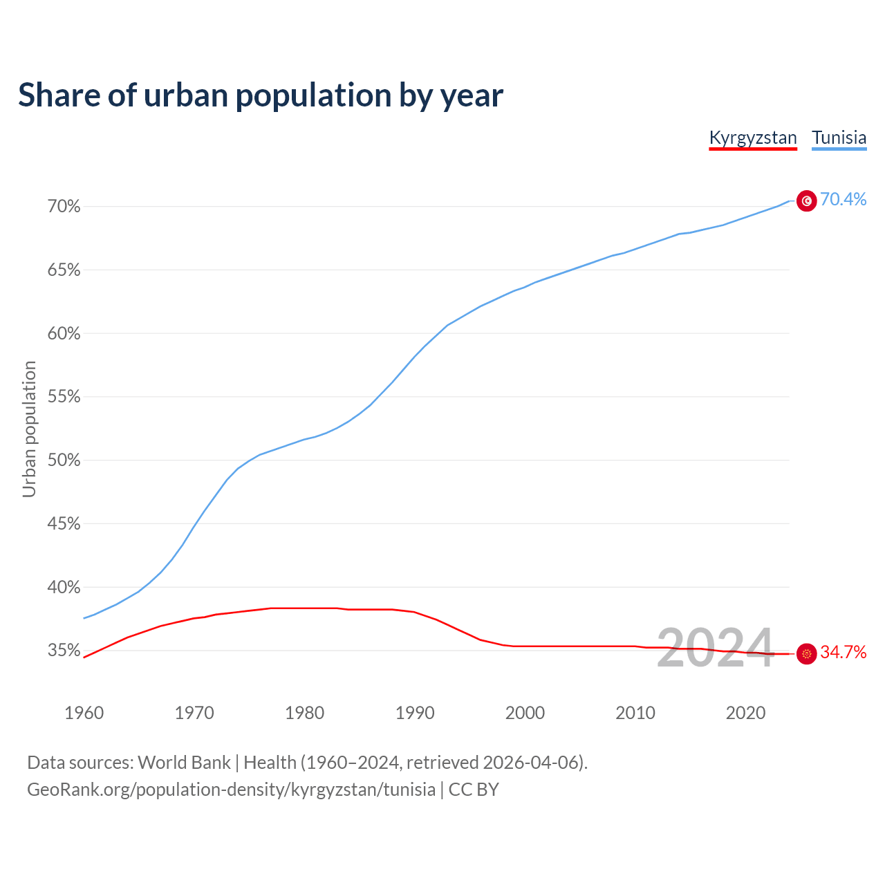 From 2004 to 2024, the share of urban population changed from 35.3% to 34.7% in Kyrgyzstan and from 64.9% to 70.4% in Tunisia.