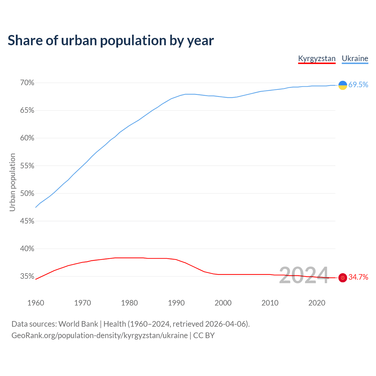 From 2004 to 2024, the share of urban population changed from 35.3% to 34.7% in Kyrgyzstan and from 67.6% to 69.5% in Ukraine.