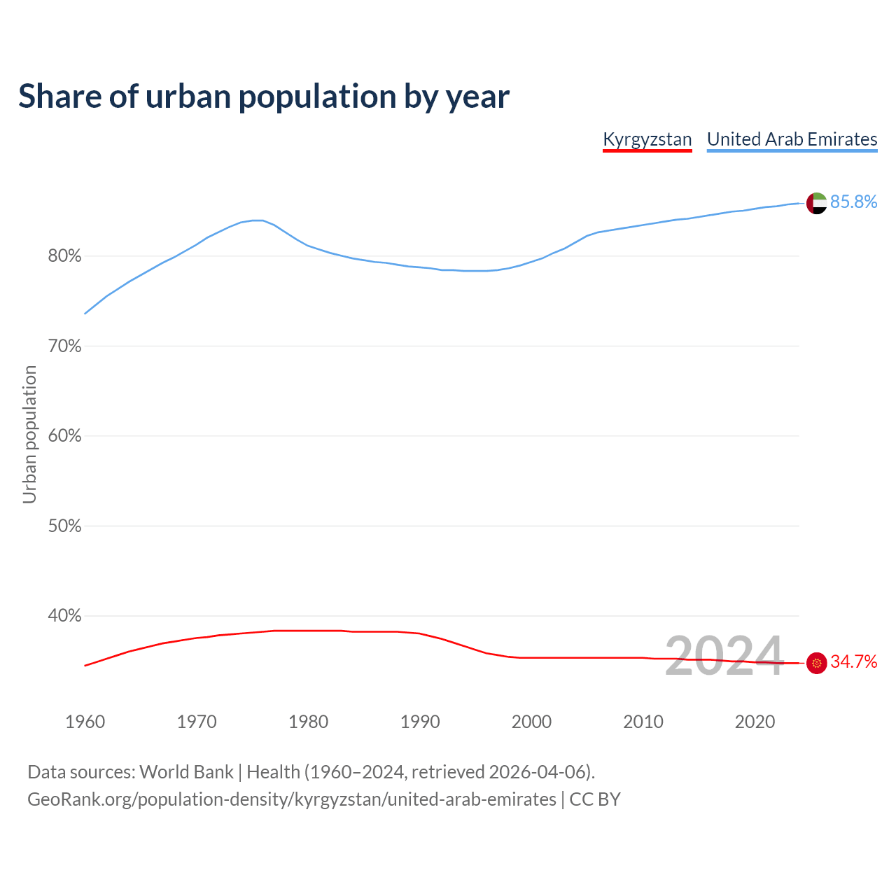 From 2004 to 2024, the share of urban population changed from 35.3% to 34.7% in Kyrgyzstan and from 81.5% to 85.8% in the United Arab Emirates.