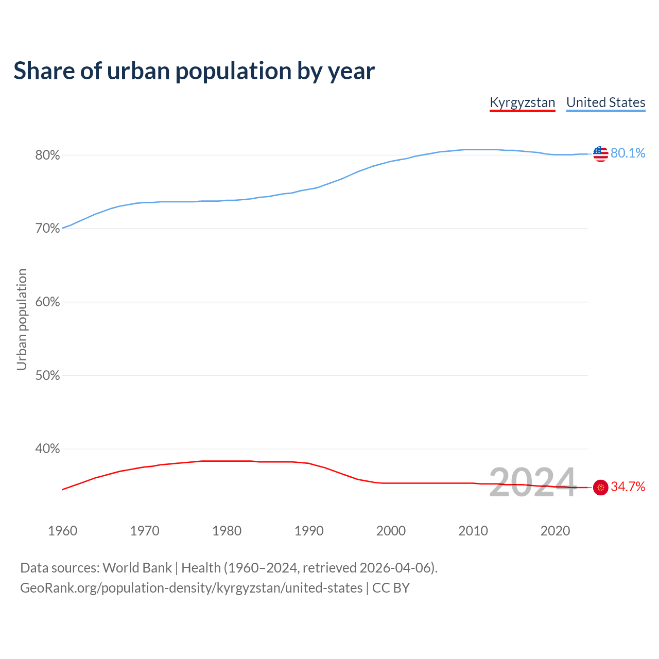 From 2004 to 2024, the share of urban population changed from 35.3% to 34.7% in Kyrgyzstan and from 80% to 80.1% in the United States.