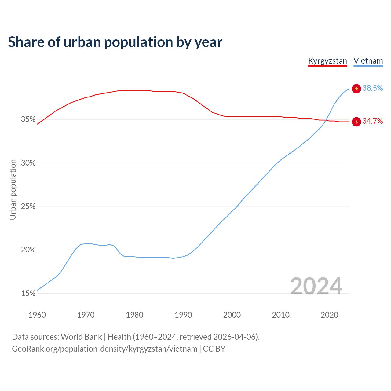 From 2004 to 2024, the share of urban population changed from 35.3% to 34.7% in Kyrgyzstan and from 26.8% to 38.5% in Vietnam.