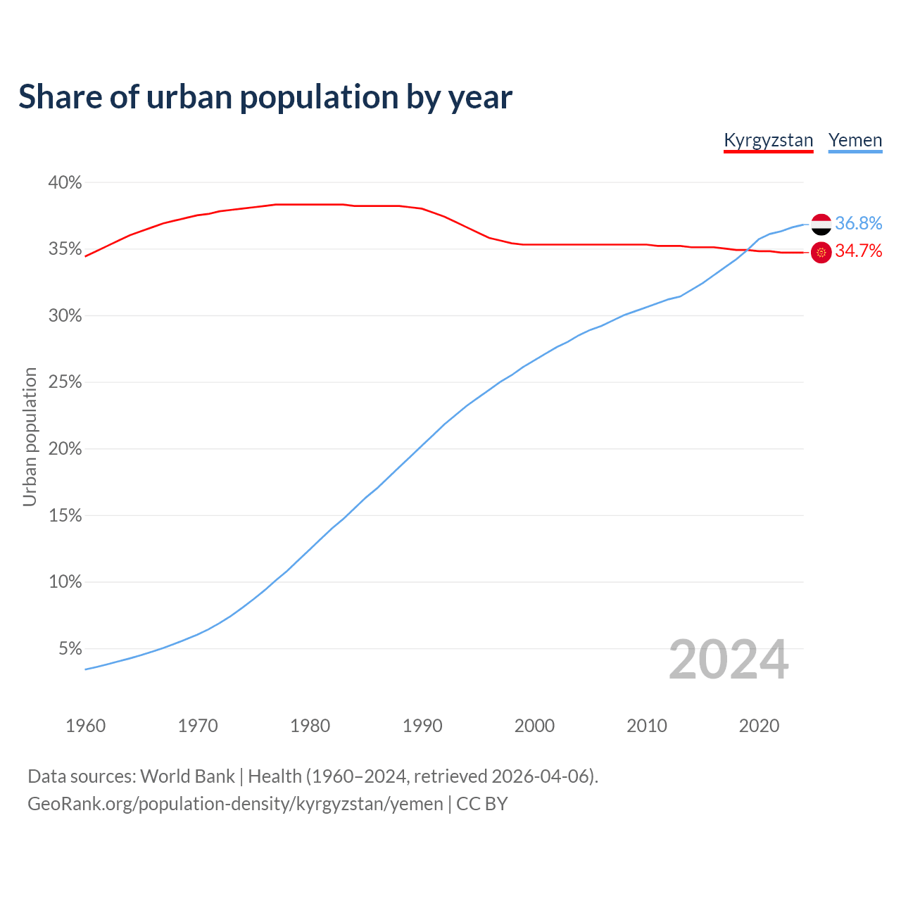 From 2004 to 2024, the share of urban population changed from 35.3% to 34.7% in Kyrgyzstan and from 28.5% to 36.8% in Yemen.