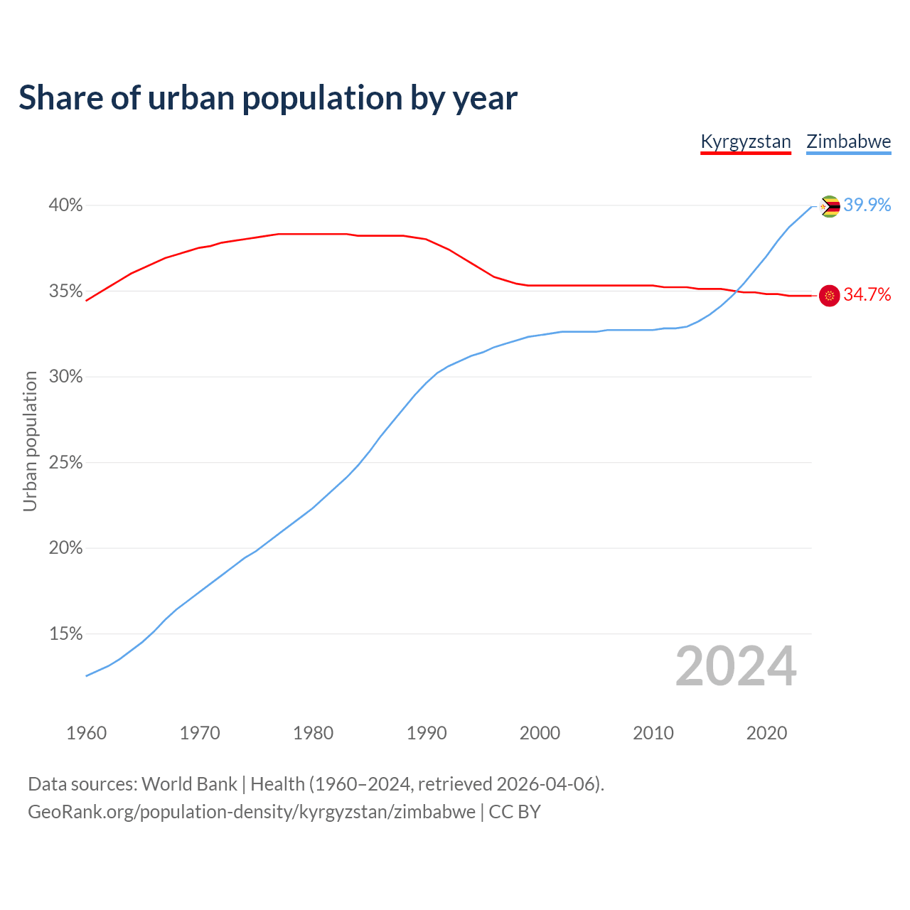 From 2004 to 2024, the share of urban population changed from 35.3% to 34.7% in Kyrgyzstan and from 32.6% to 39.9% in Zimbabwe.