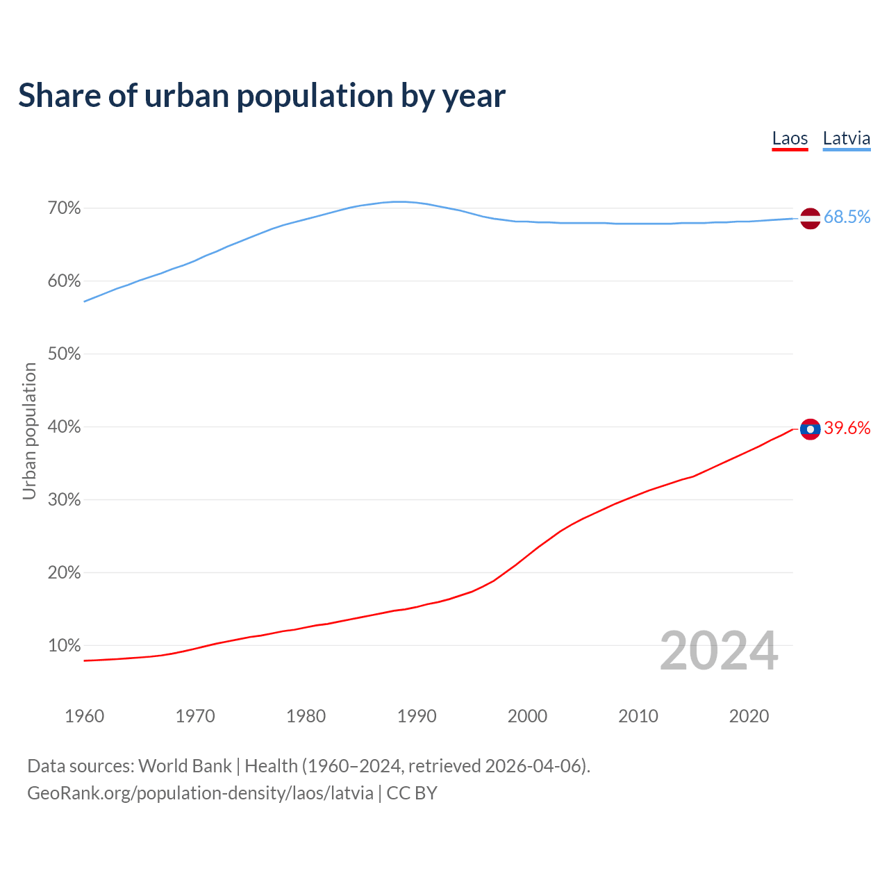 From 2004 to 2024, the share of urban population changed from 26.5% to 39.6% in Laos and from 67.9% to 68.5% in Latvia.