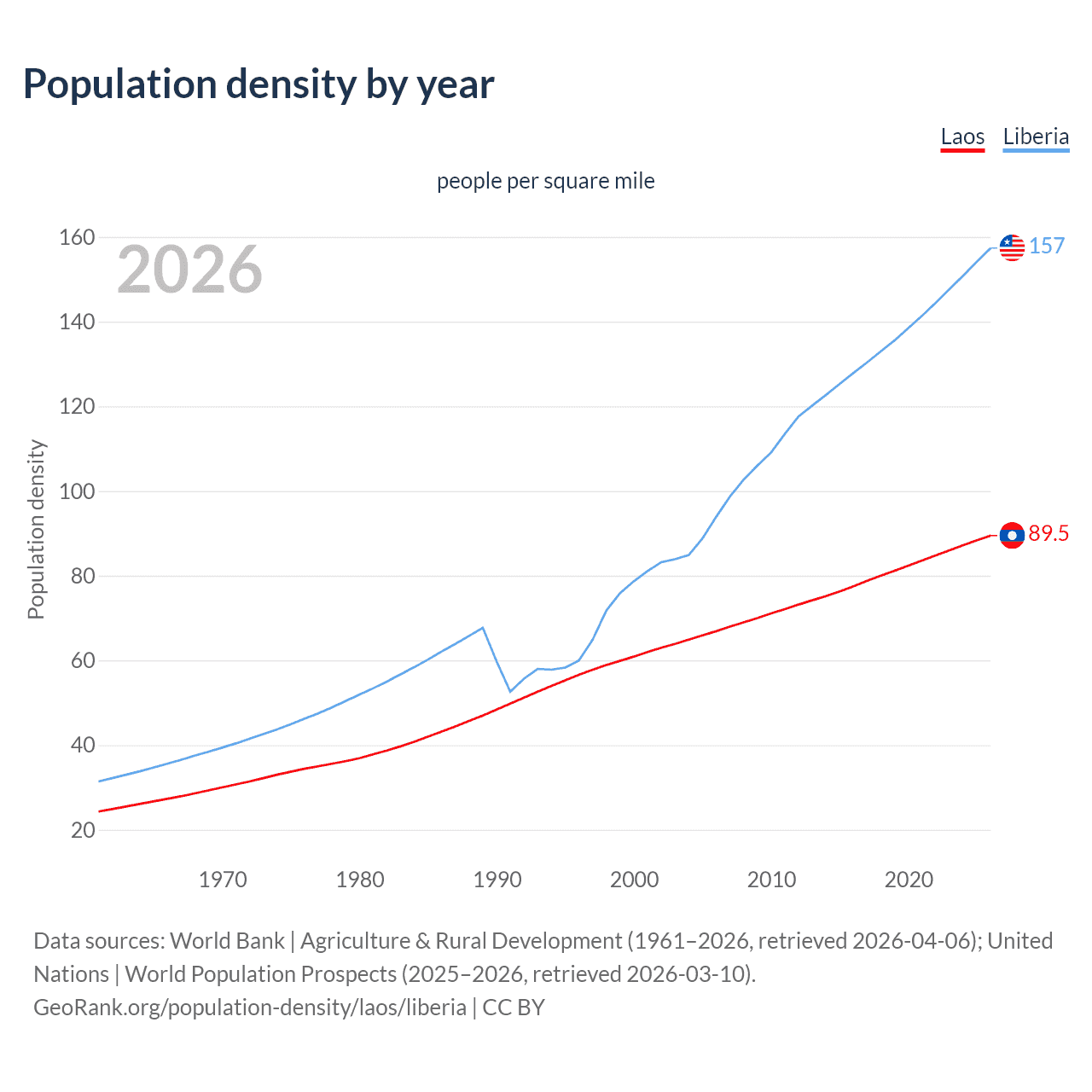 Laos has a population density of 89.5 people per square mile compared to 157.4 people in Liberia. Laos has 328,051 sq ft of land per person vs 213,577 sq ft in Liberia. Laos and Liberia rank 150th and 130th by population density, respectively.
