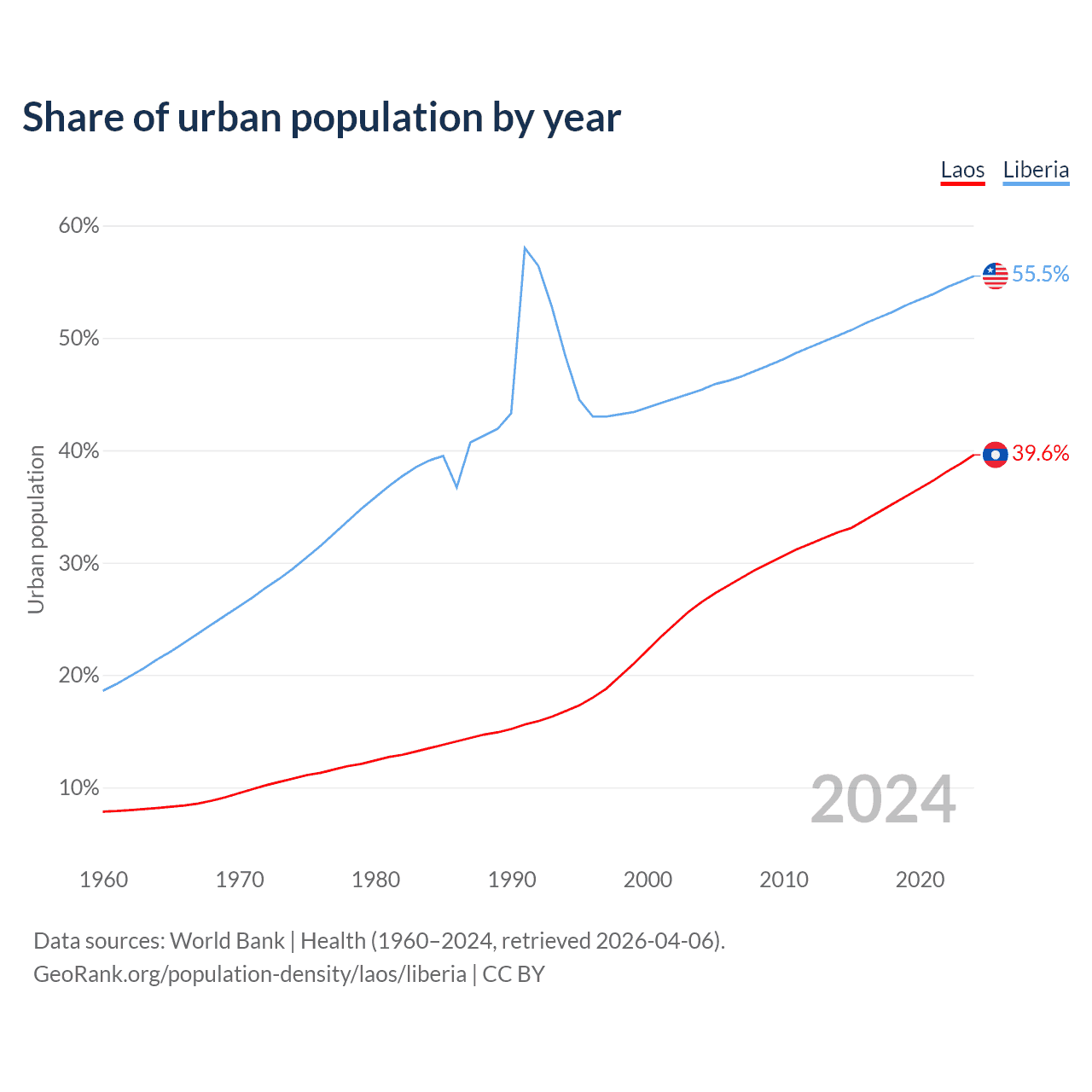 From 2004 to 2024, the share of urban population changed from 26.5% to 39.6% in Laos and from 45.4% to 55.5% in Liberia.