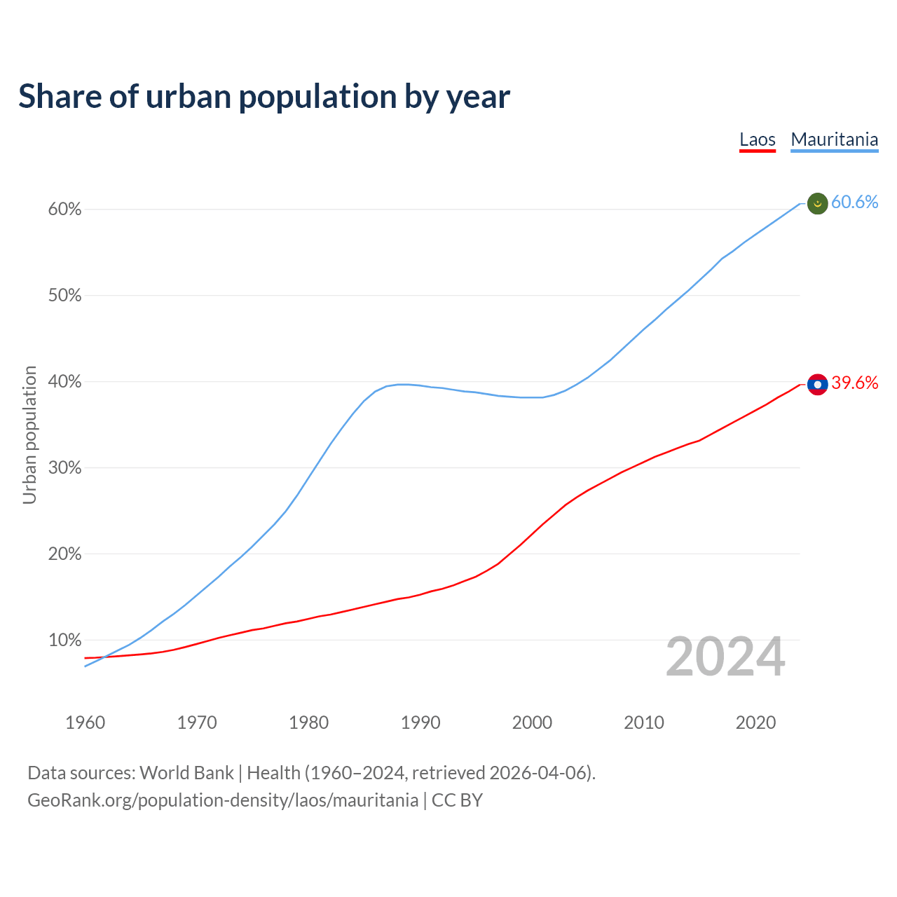 From 2004 to 2024, the share of urban population changed from 26.5% to 39.6% in Laos and from 39.6% to 60.6% in Mauritania.