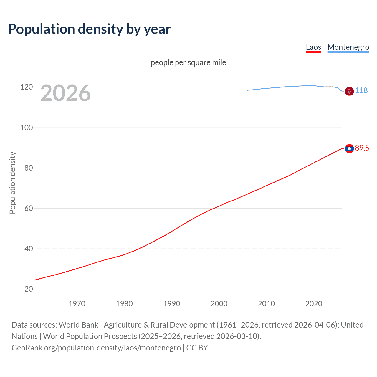 From 2006 to 2026, population density in Laos increased by 33.8%, compared to a 0.44% decline in Montenegro.