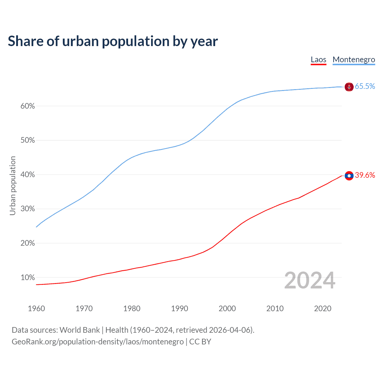 From 2004 to 2024, the share of urban population changed from 26.5% to 39.6% in Laos and from 62.2% to 65.5% in Montenegro.