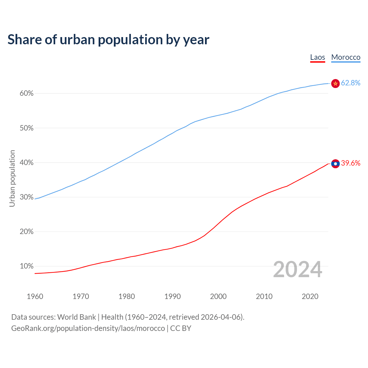 From 2004 to 2024, the share of urban population changed from 26.5% to 39.6% in Laos and from 55% to 62.8% in Morocco.