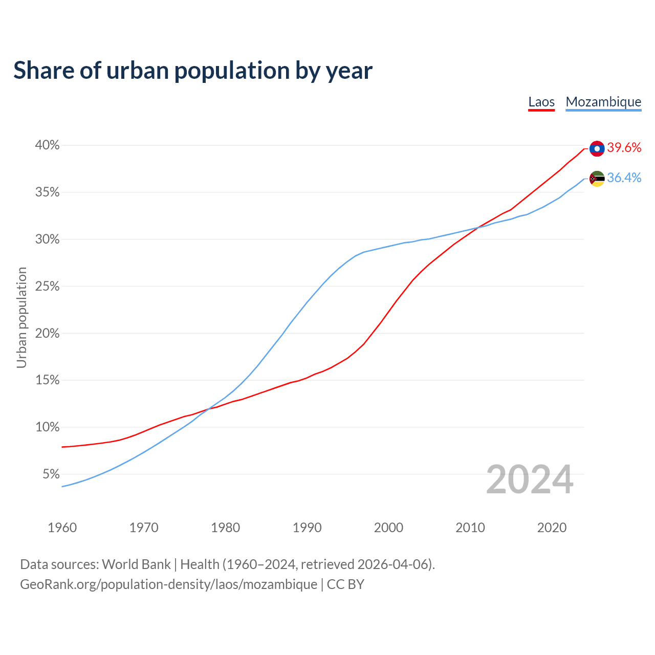 From 2004 to 2024, the share of urban population changed from 26.5% to 39.6% in Laos and from 29.9% to 36.4% in Mozambique.