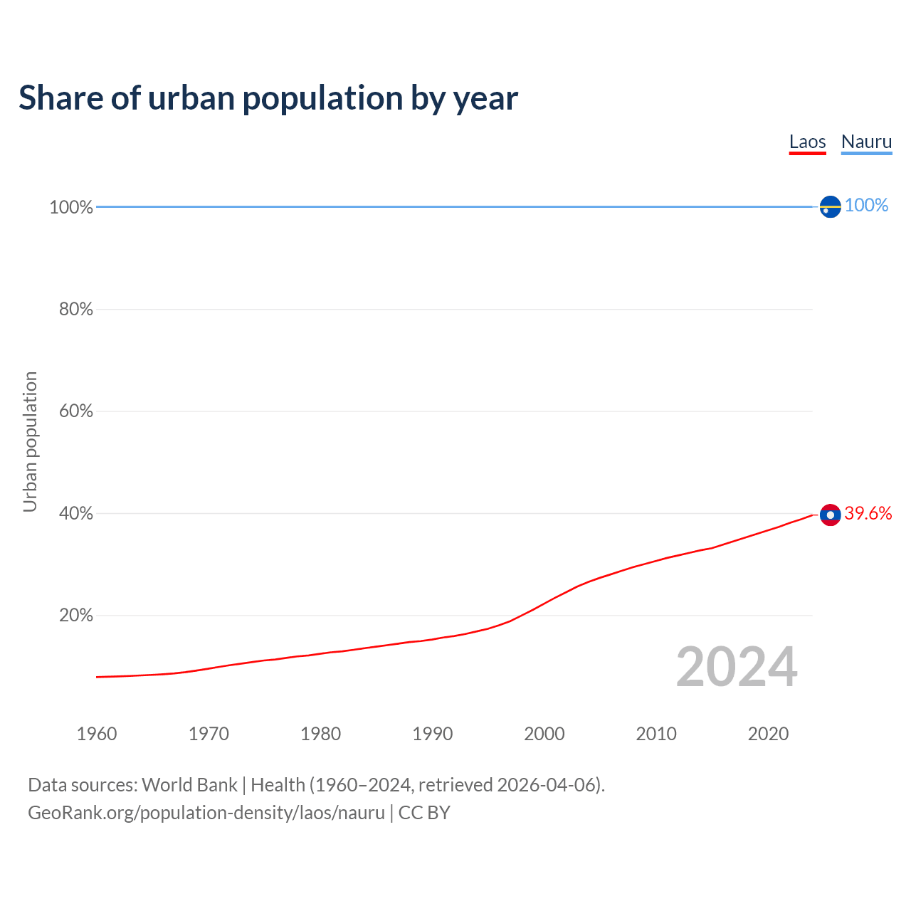 From 2006 to 2026, population density in Laos increased by 33.8%, compared to a 20.6% growth in Nauru.