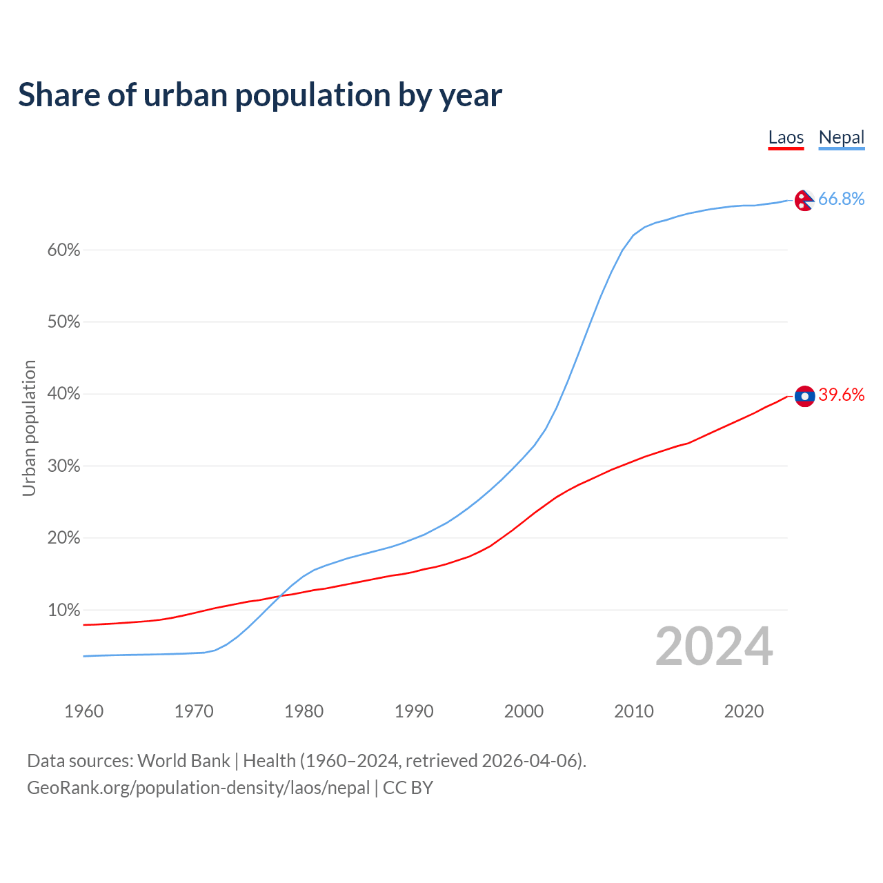 From 2004 to 2024, the share of urban population changed from 26.5% to 39.6% in Laos and from 41.6% to 66.8% in Nepal.