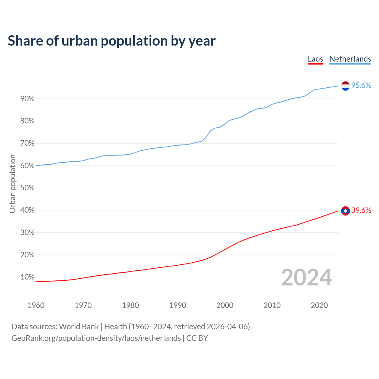 From 2004 to 2024, the share of urban population changed from 26.5% to 39.6% in Laos and from 82.3% to 95.6% in the Netherlands.