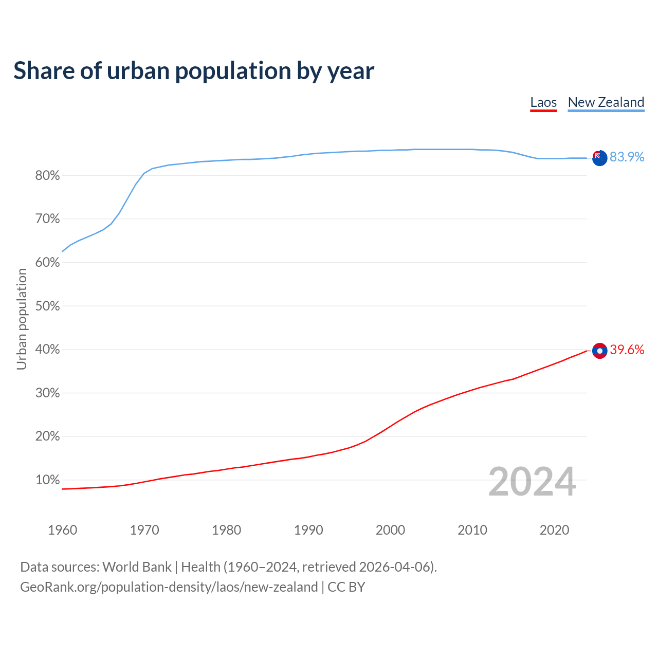 From 2004 to 2024, the share of urban population changed from 26.5% to 39.6% in Laos and from 85.9% to 83.9% in New Zealand.