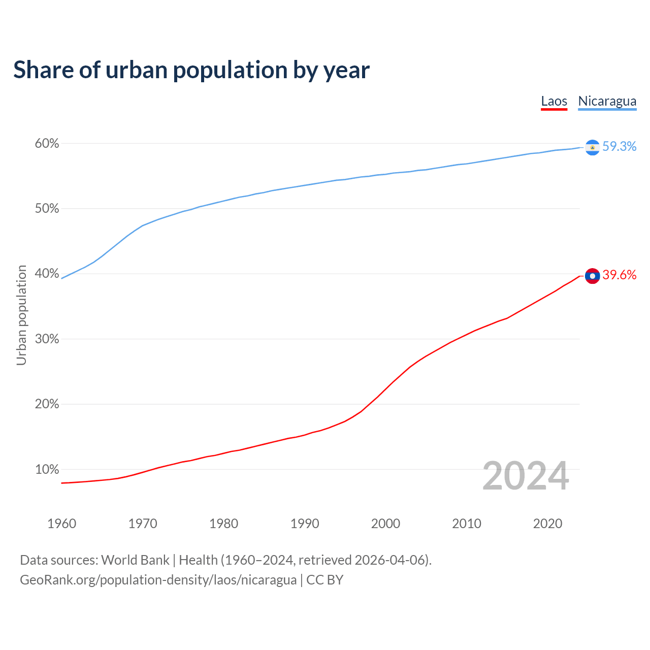 From 2004 to 2024, the share of urban population changed from 26.5% to 39.6% in Laos and from 55.8% to 59.3% in Nicaragua.