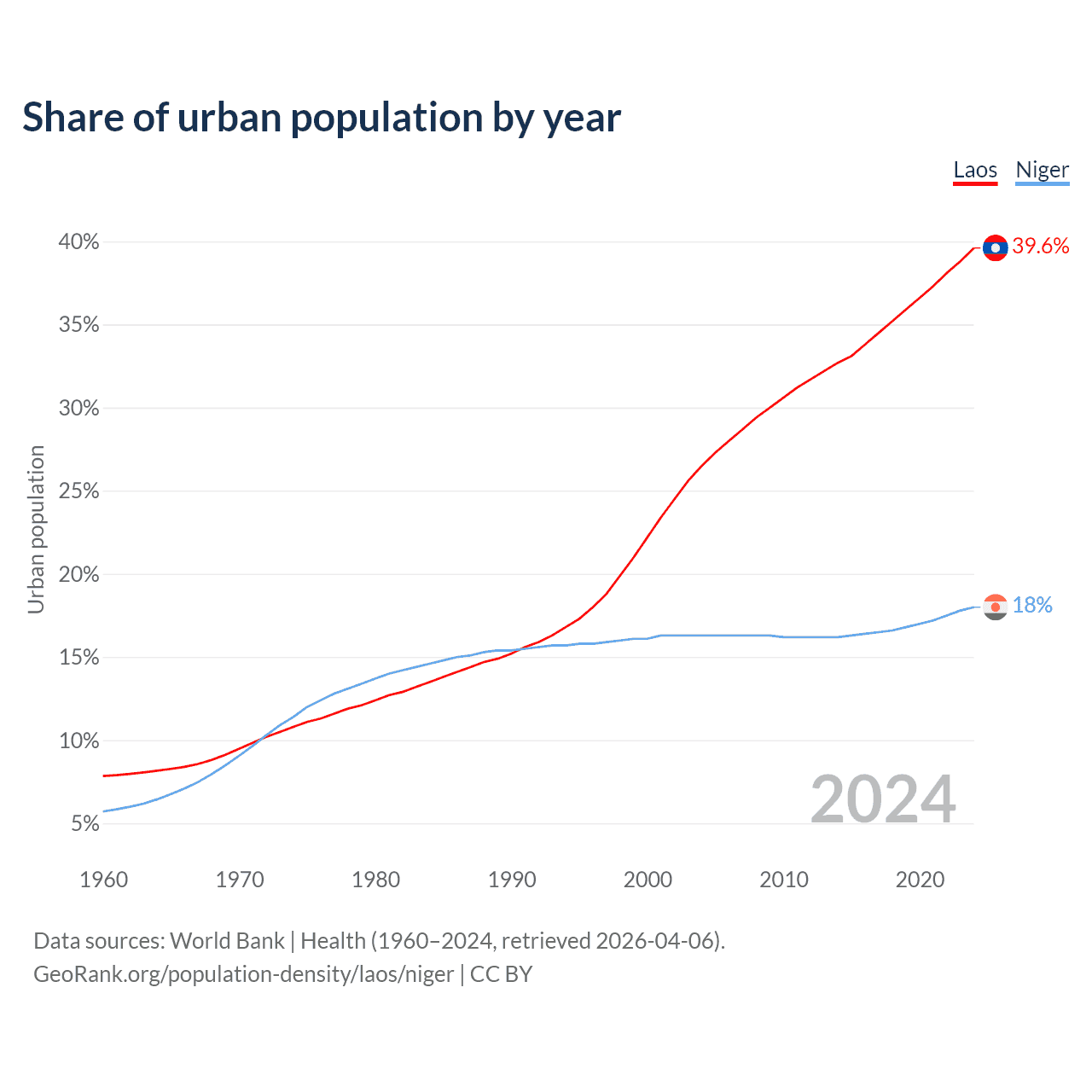 From 2004 to 2024, the share of urban population changed from 26.5% to 39.6% in Laos and from 16.3% to 18% in Niger.
