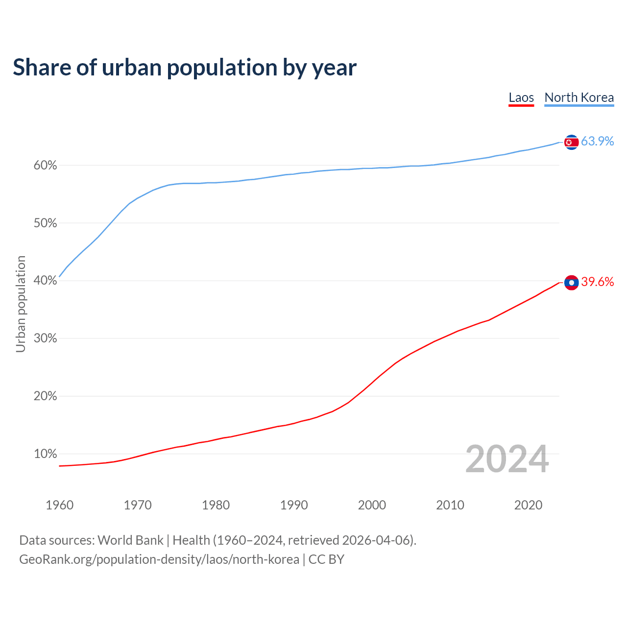 From 2004 to 2024, the share of urban population changed from 26.5% to 39.6% in Laos and from 59.7% to 63.9% in North Korea.