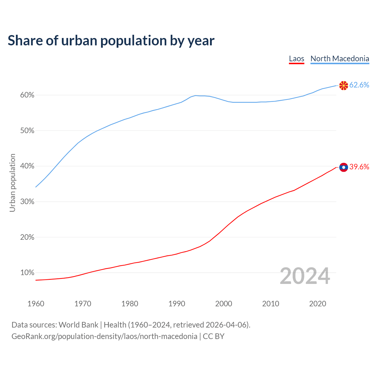 From 2004 to 2024, the share of urban population changed from 26.5% to 39.6% in Laos and from 57.9% to 62.6% in North Macedonia.