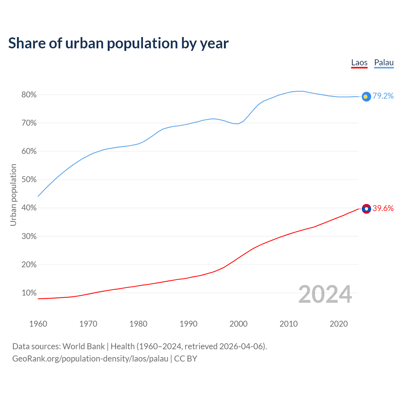 From 2004 to 2024, the share of urban population changed from 26.5% to 39.6% in Laos and from 76.4% to 79.2% in Palau.
