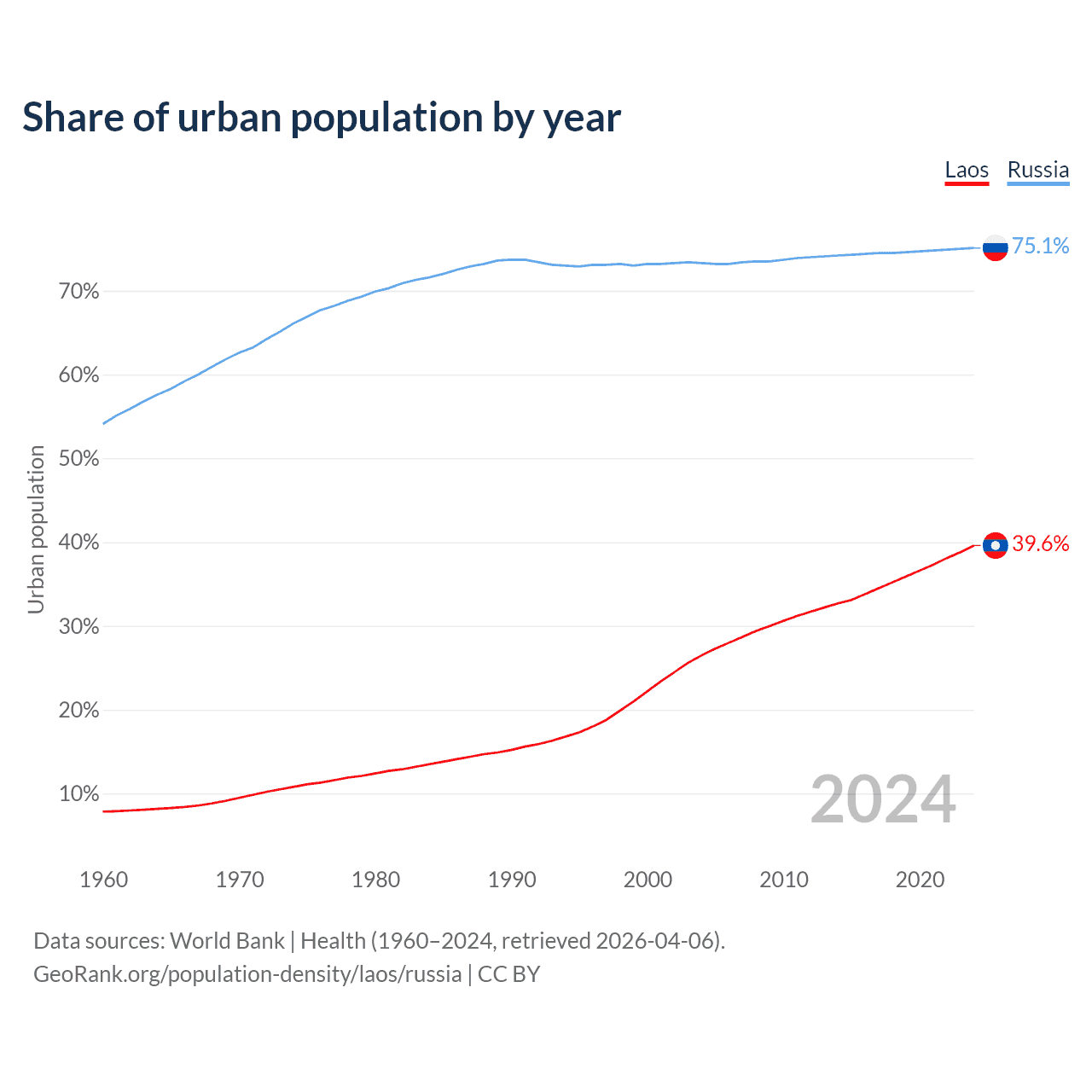 From 2004 to 2024, the share of urban population changed from 26.5% to 39.6% in Laos and from 73.3% to 75.1% in Russia.