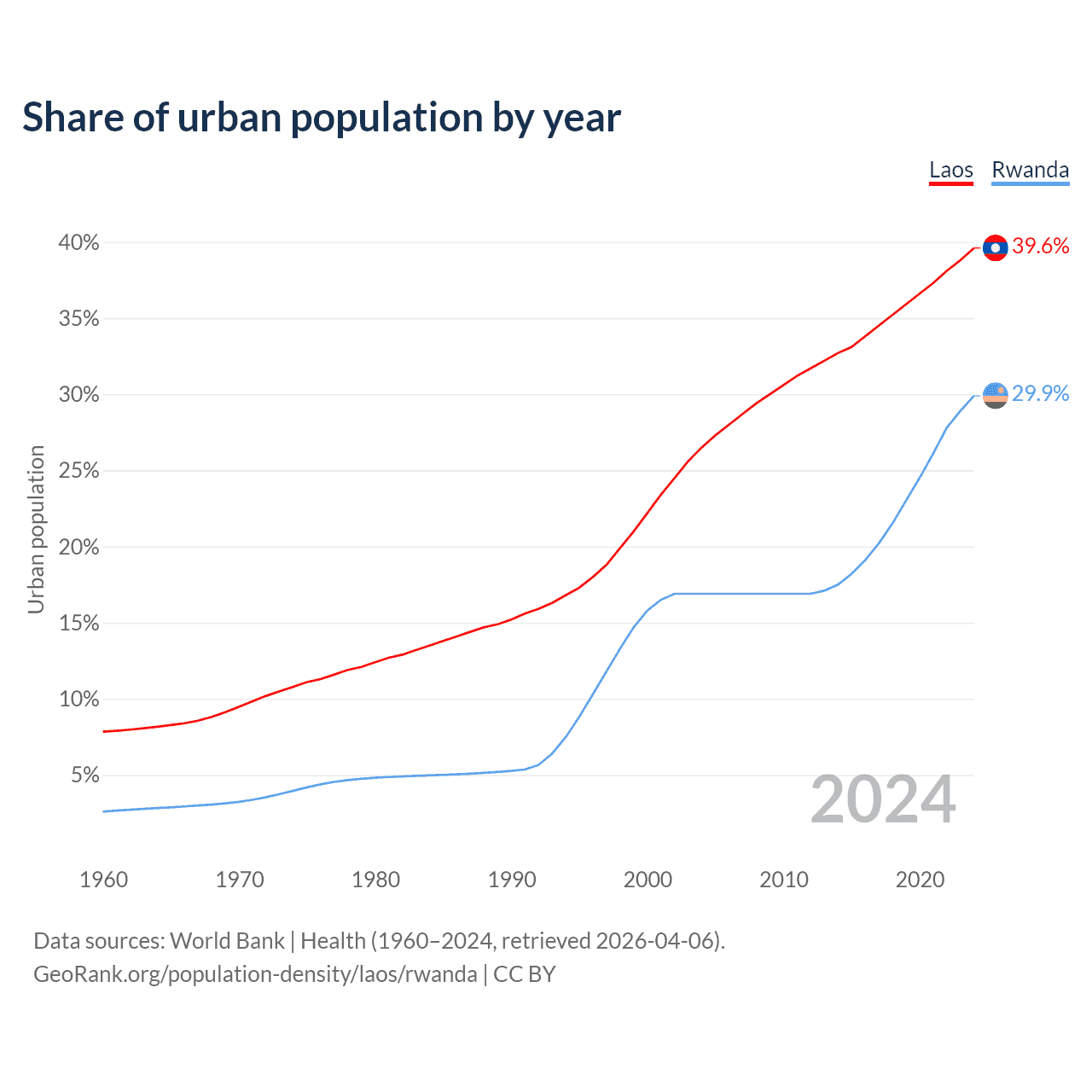 From 2004 to 2024, the share of urban population changed from 26.5% to 39.6% in Laos and from 16.9% to 29.9% in Rwanda.