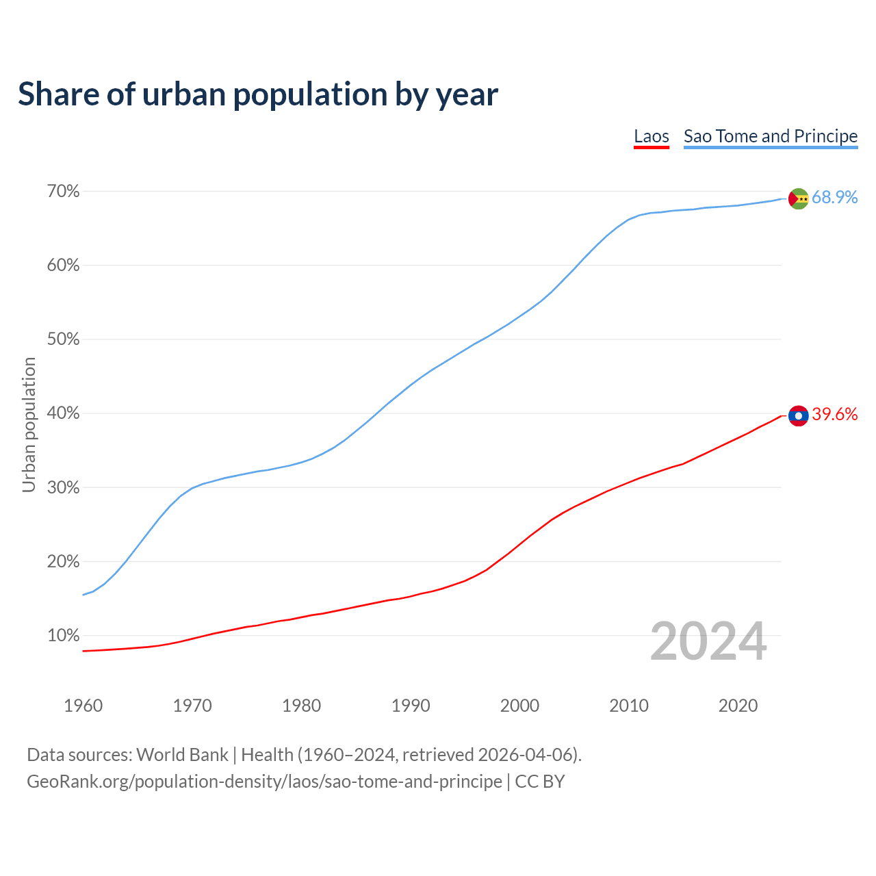 From 2004 to 2024, the share of urban population changed from 26.5% to 39.6% in Laos and from 57.9% to 68.9% in Sao Tome and Principe.