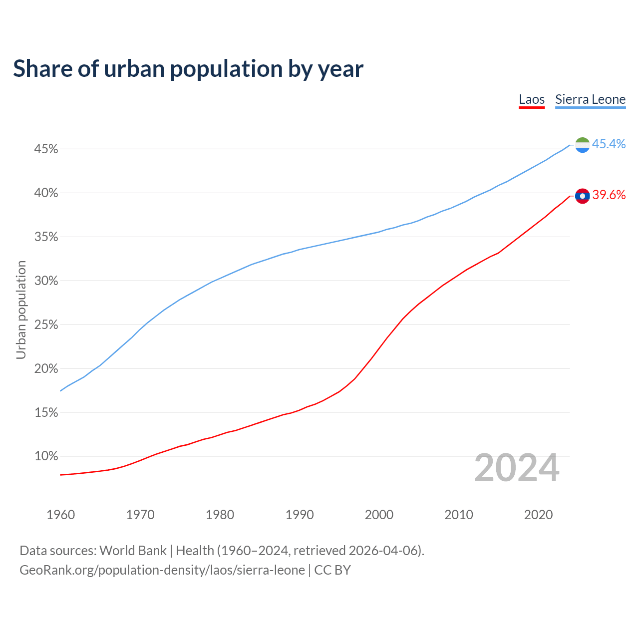 From 2004 to 2024, the share of urban population changed from 26.5% to 39.6% in Laos and from 36.5% to 45.4% in Sierra Leone.