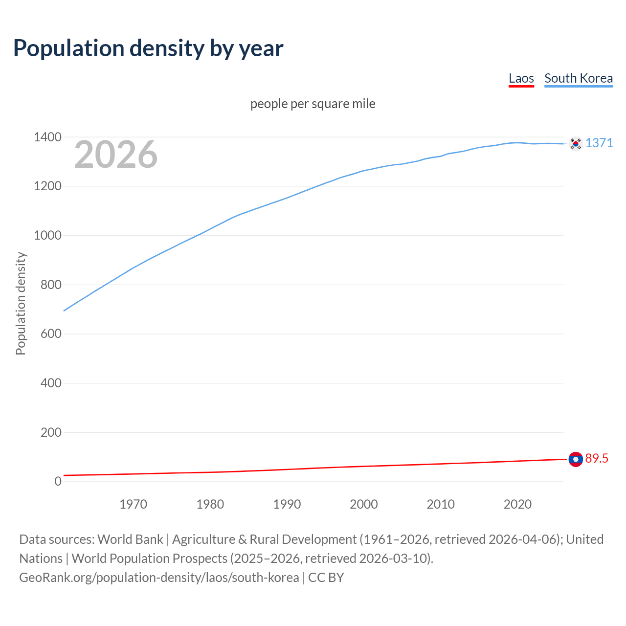 From 2006 to 2026, population density in Laos increased by 33.8%, compared to a 5.84% growth in South Korea.