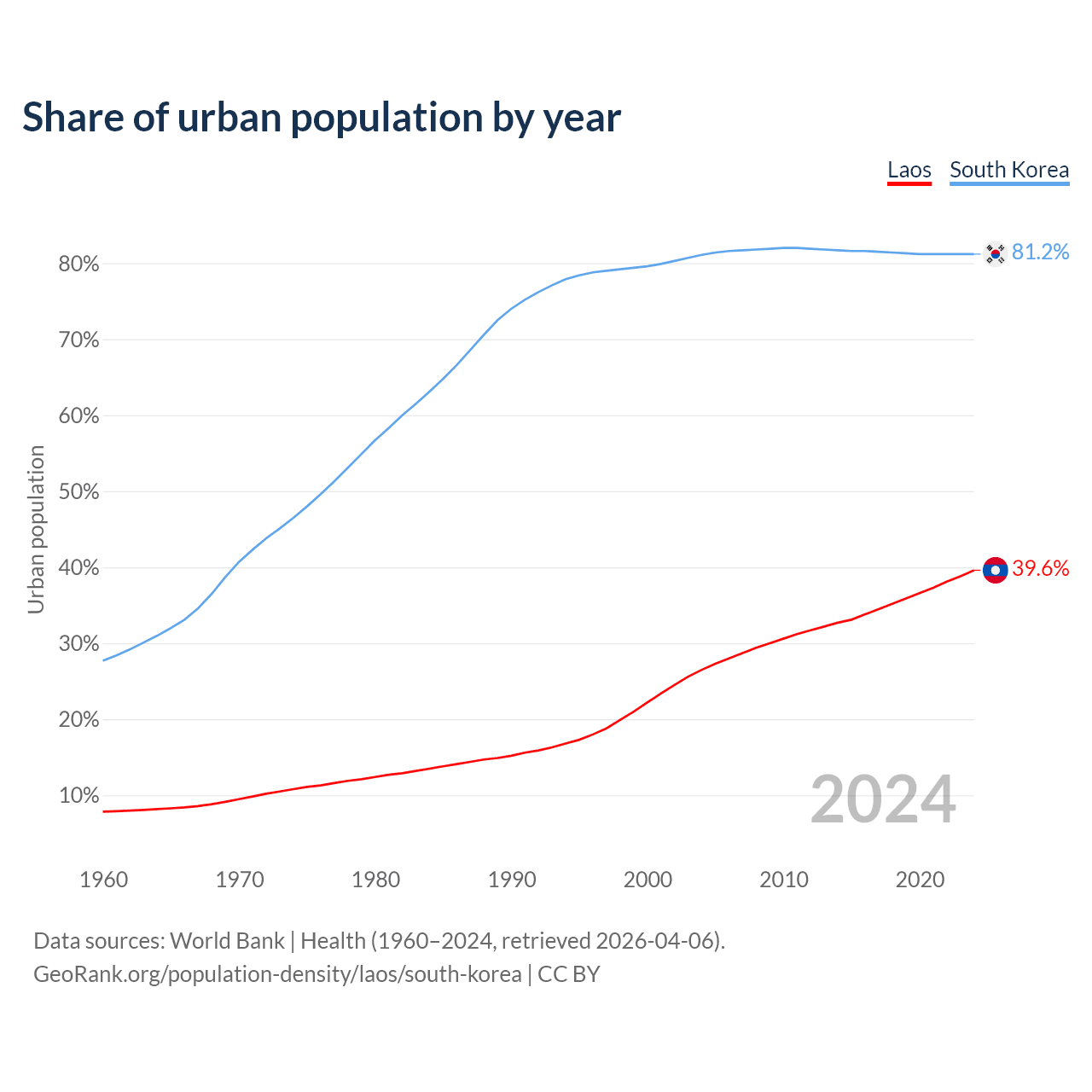 From 2004 to 2024, the share of urban population changed from 26.5% to 39.6% in Laos and from 81.1% to 81.2% in South Korea.