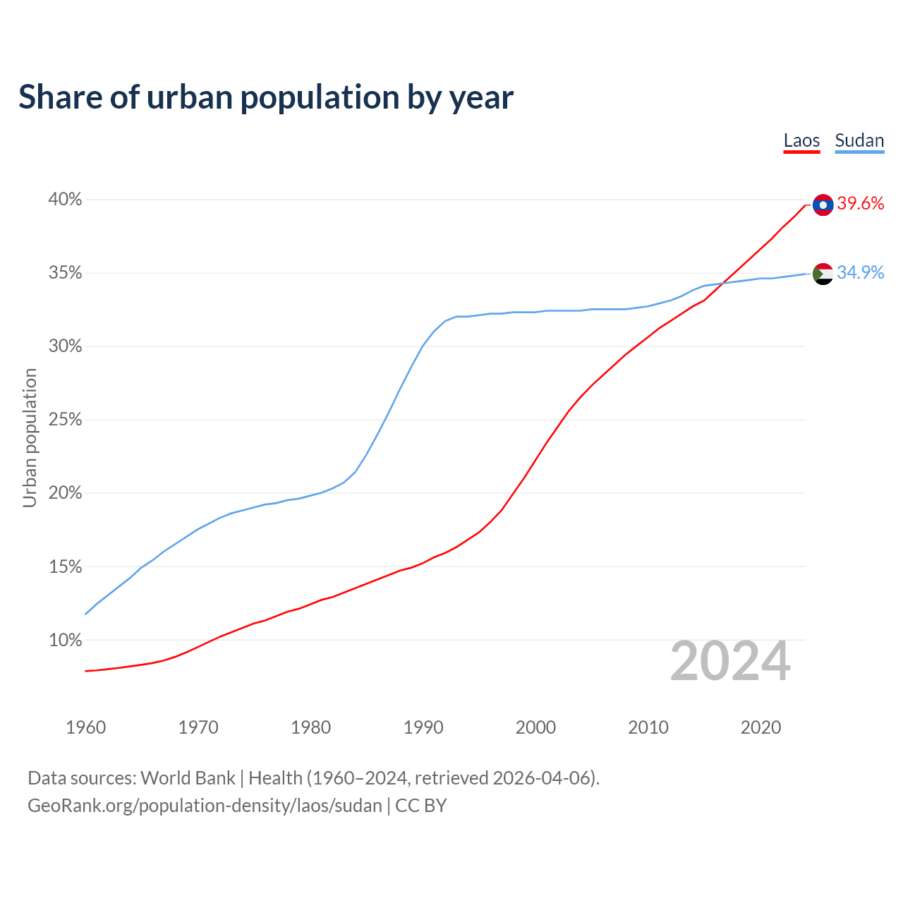 From 2004 to 2024, the share of urban population changed from 26.5% to 39.6% in Laos and from 32.4% to 34.9% in Sudan.