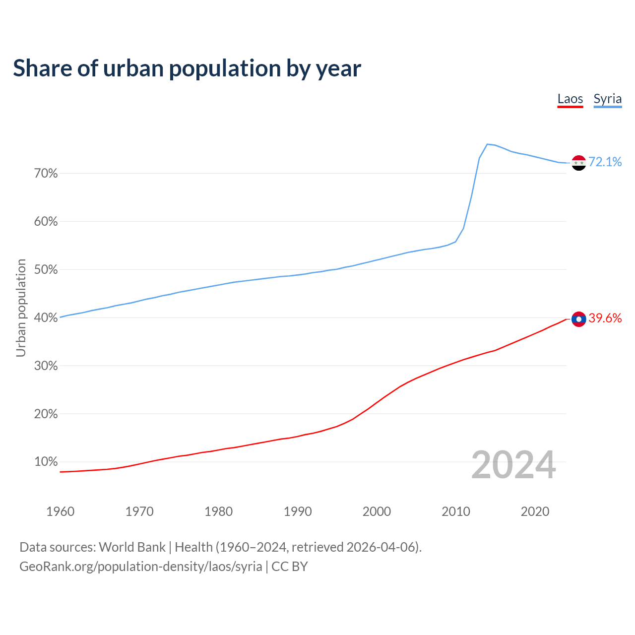 From 2004 to 2024, the share of urban population changed from 26.5% to 39.6% in Laos and from 53.5% to 72.1% in Syria.