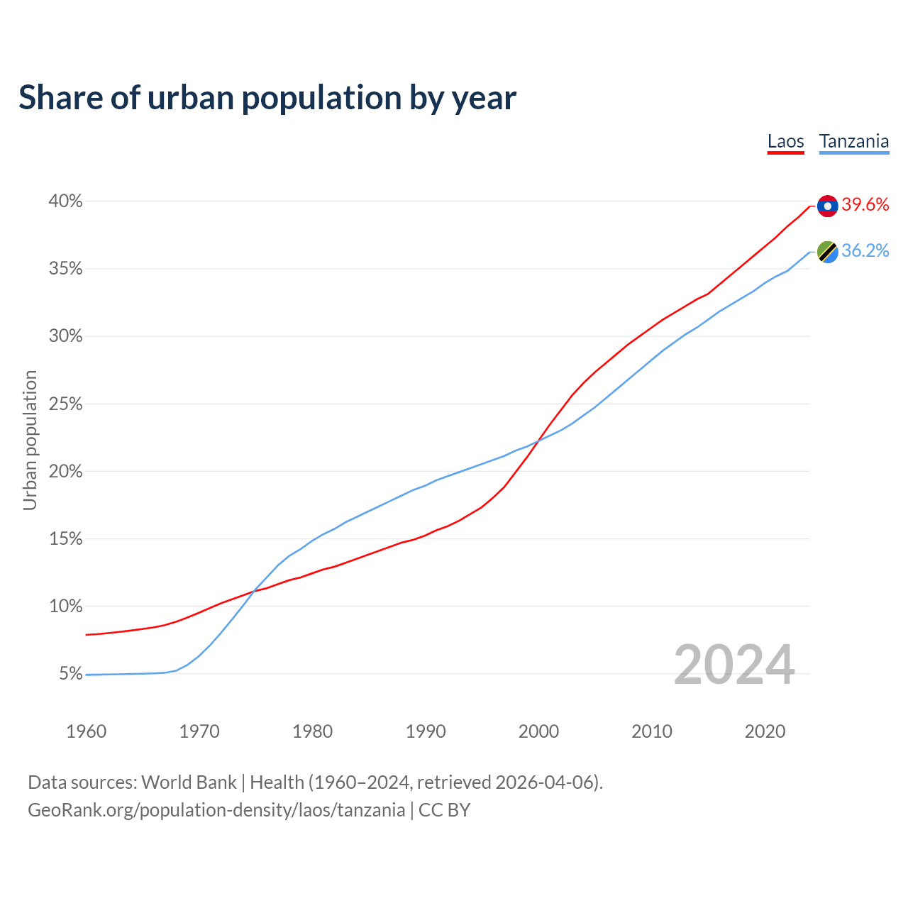 From 2004 to 2024, the share of urban population changed from 26.5% to 39.6% in Laos and from 24.1% to 36.2% in Tanzania.