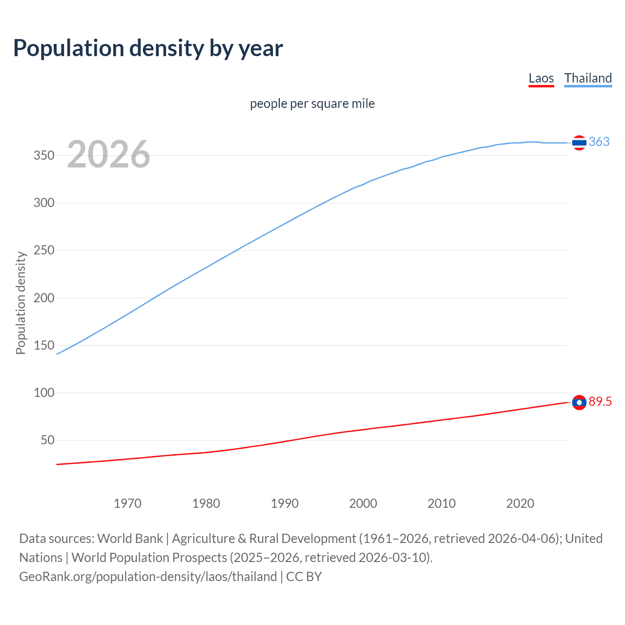 From 2006 to 2026, population density in Laos increased by 33.8%, compared to a 7.52% growth in Thailand.