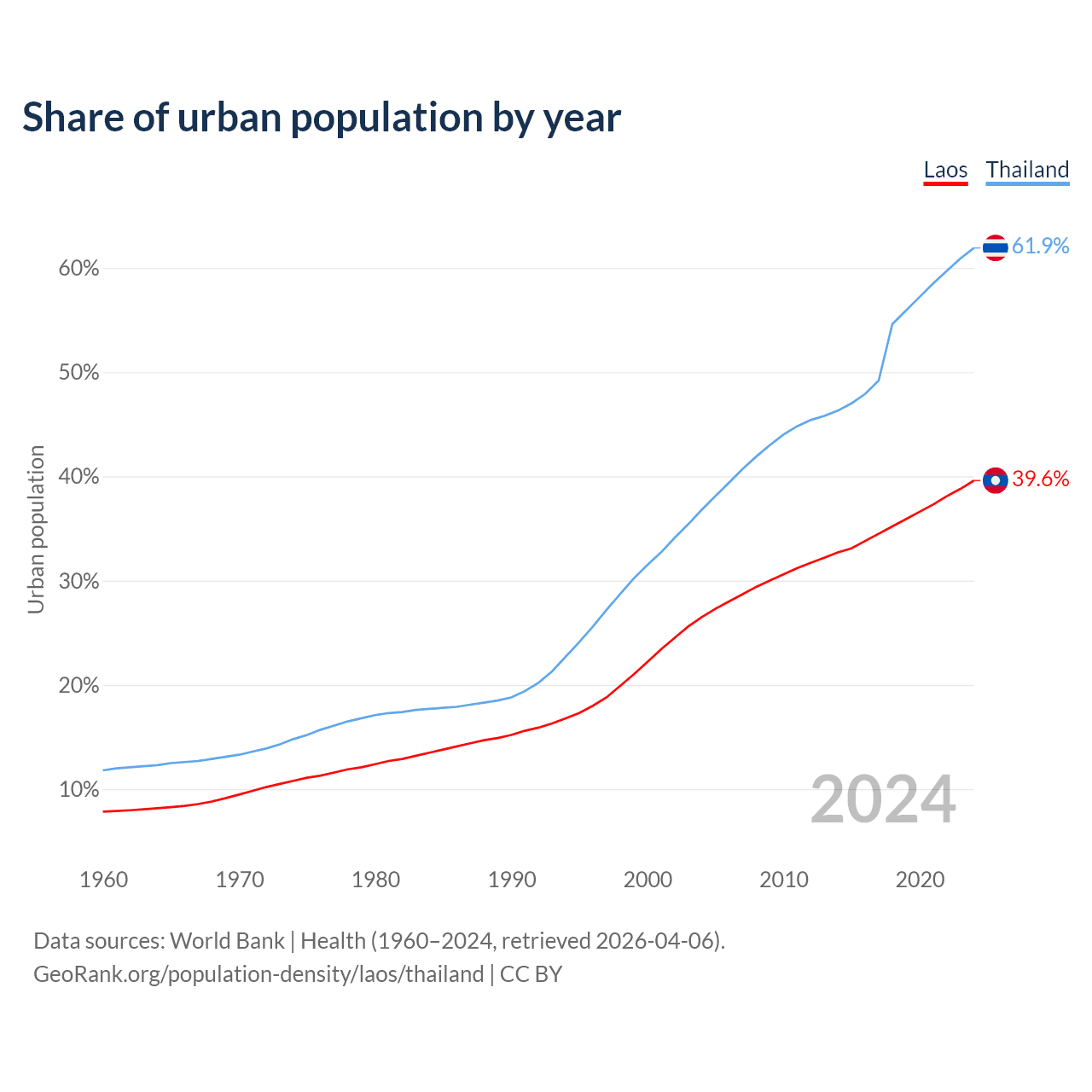 From 2004 to 2024, the share of urban population changed from 26.5% to 39.6% in Laos and from 36.8% to 61.9% in Thailand.