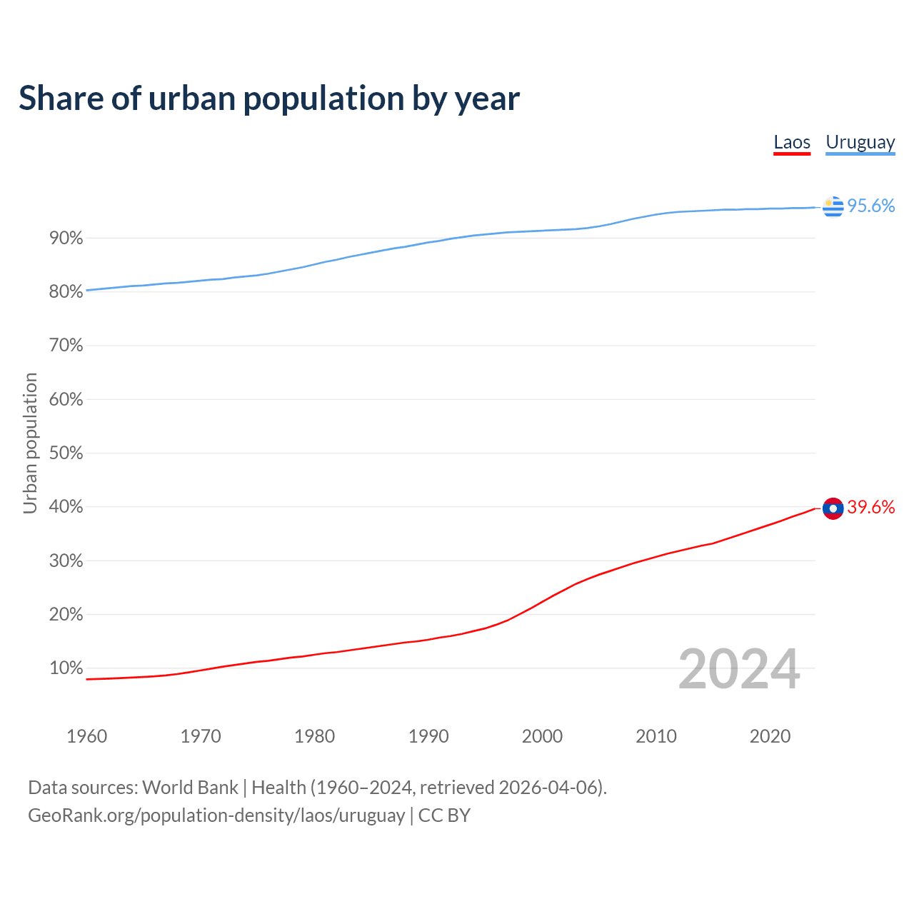 From 2004 to 2024, the share of urban population changed from 26.5% to 39.6% in Laos and from 91.8% to 95.6% in Uruguay.