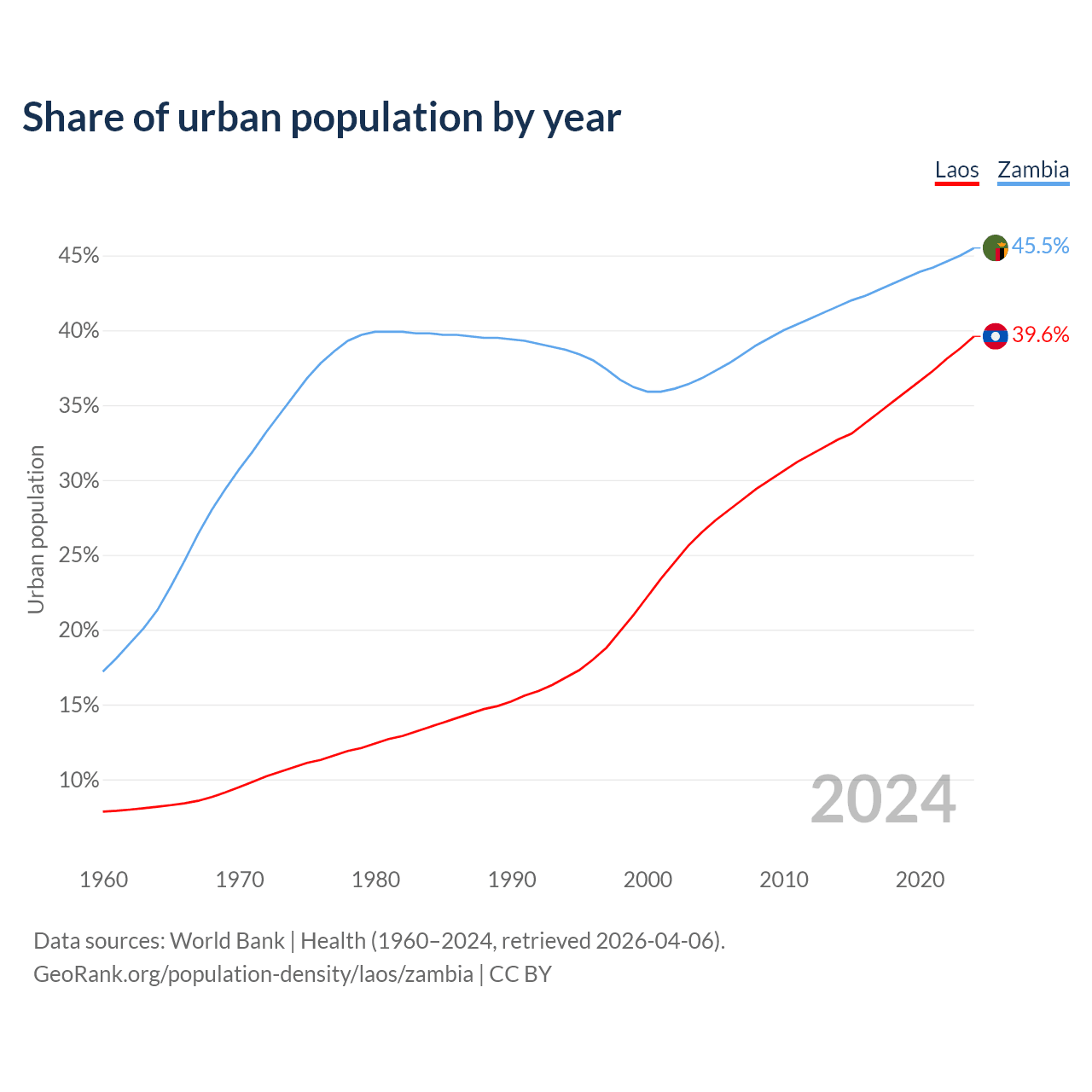 From 2004 to 2024, the share of urban population changed from 26.5% to 39.6% in Laos and from 36.8% to 45.5% in Zambia.