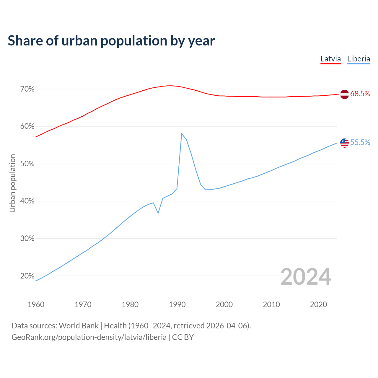 From 2004 to 2024, the share of urban population changed from 67.9% to 68.5% in Latvia and from 45.4% to 55.5% in Liberia.
