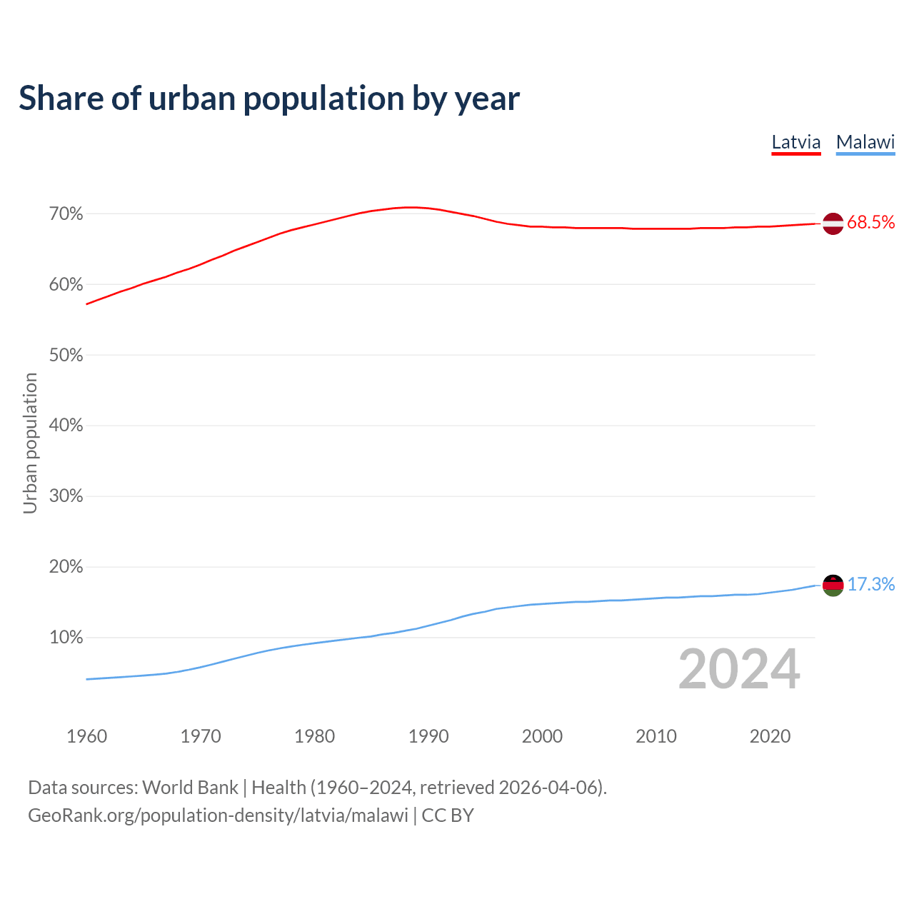 From 2004 to 2024, the share of urban population changed from 67.9% to 68.5% in Latvia and from 15% to 17.3% in Malawi.