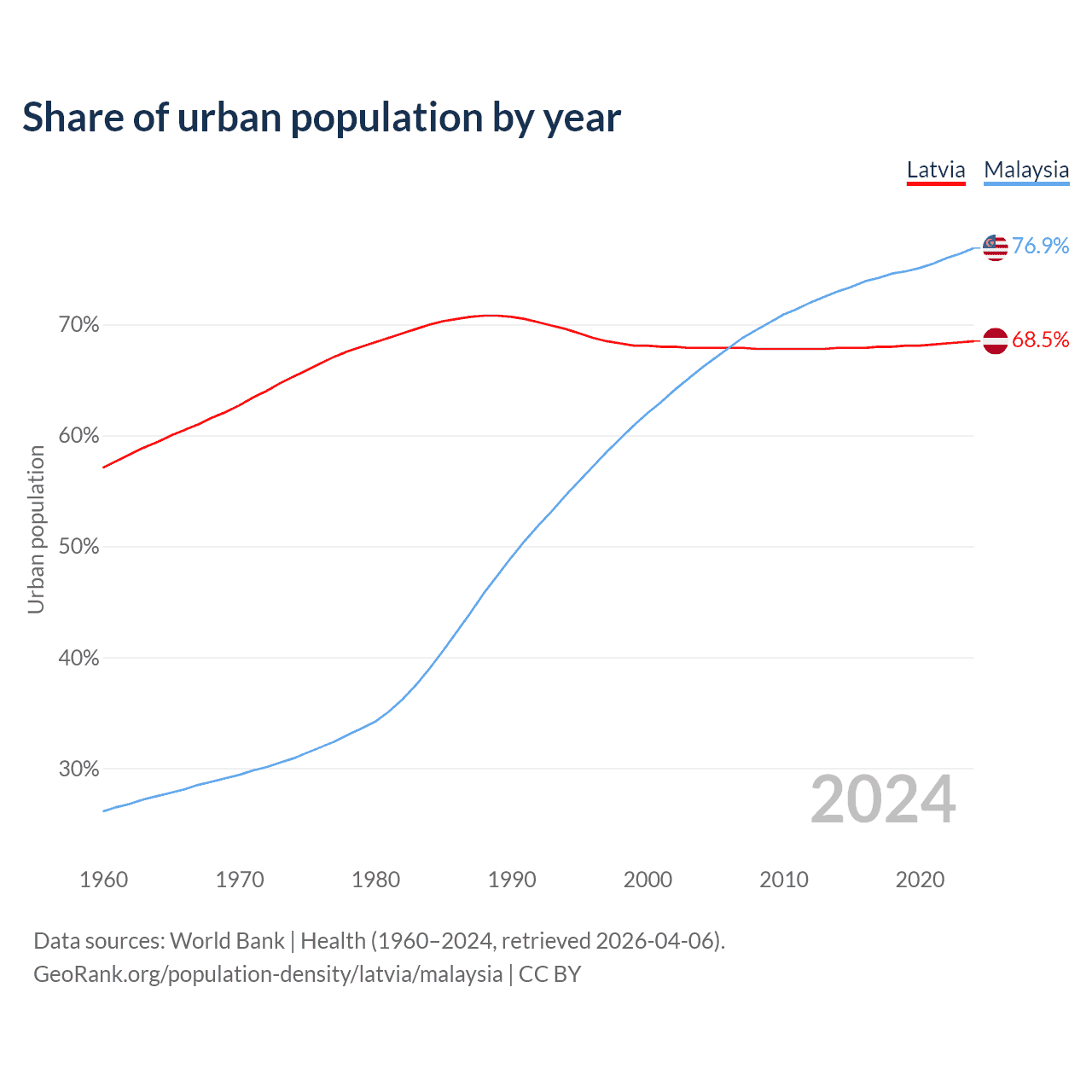 From 2004 to 2024, the share of urban population changed from 67.9% to 68.5% in Latvia and from 66.1% to 76.9% in Malaysia.