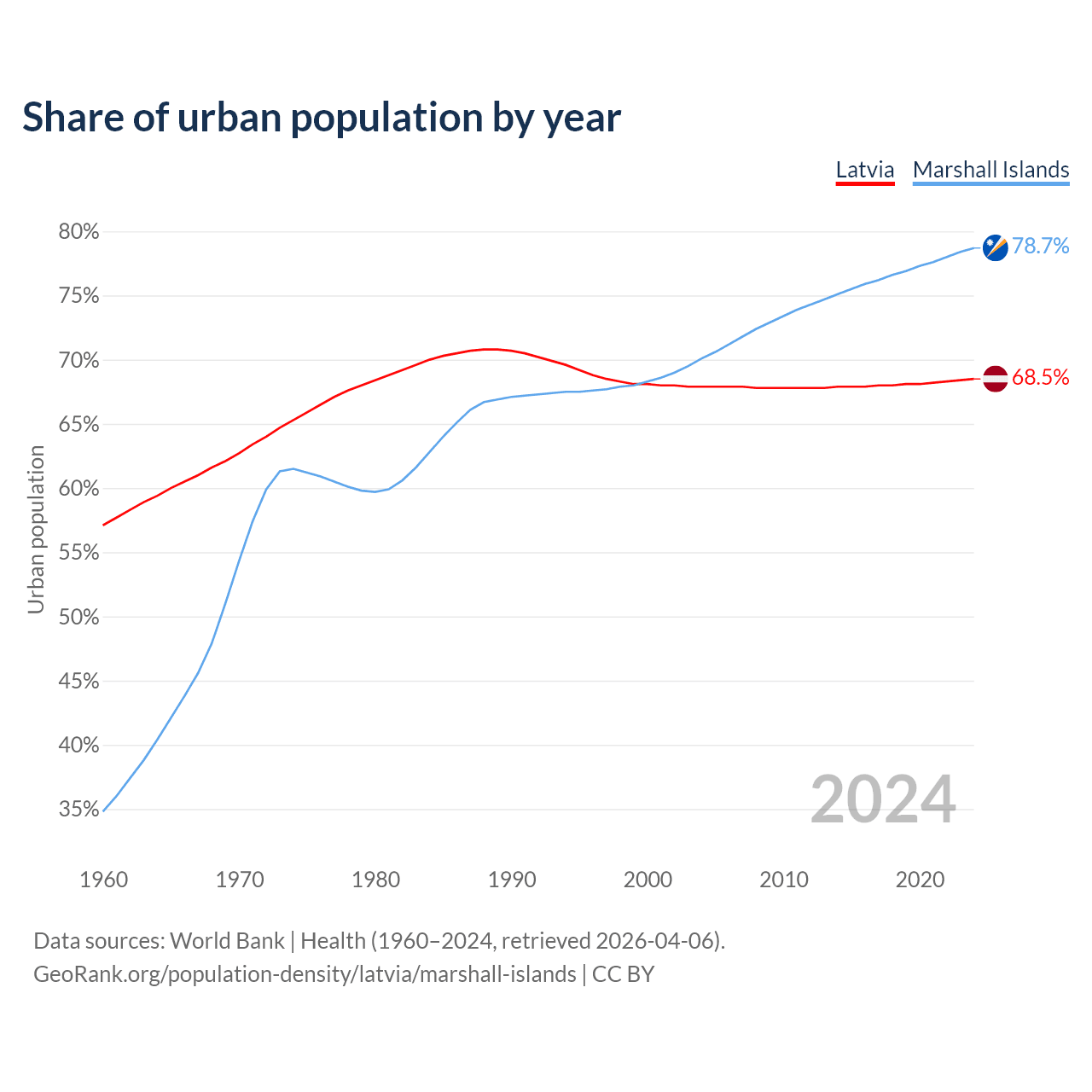 From 2004 to 2024, the share of urban population changed from 67.9% to 68.5% in Latvia and from 70.1% to 78.7% in the Marshall Islands.