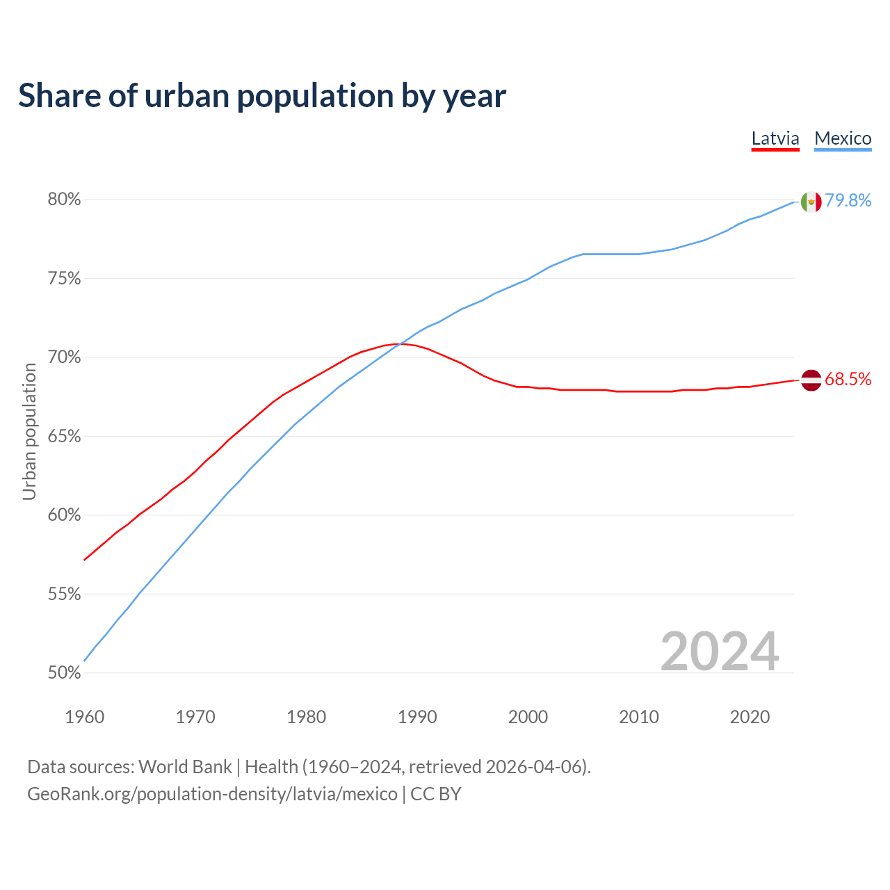 From 2004 to 2024, the share of urban population changed from 67.9% to 68.5% in Latvia and from 76.3% to 79.8% in Mexico.